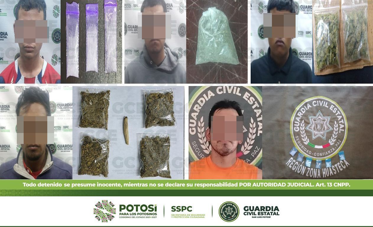 Sobre la colonia Jaime Torres Bodet, fue detenido Javier de 19 años con una dosis de “cristal” y un cuchillo de 20 centímetros; al interior del Parque Tangamanga Uno, oficiales de la GCE detuvieron a Luis de 32 años con una bolsa que contenía marihuana y un cigarro del mismo enervante; en la colonia La Libertad, fue detenido Jiovanni de 21 años con dos dosis de marihuana; Francisco de 21 años de edad, fue detenido en la colonia San Luis Rey, con dos dosis de marihuana y una pipa; en la colonia Imperio Azteca, también fue detenido Luis de 32 años con dos dosis de “cristal” y una dosis de marihuana.