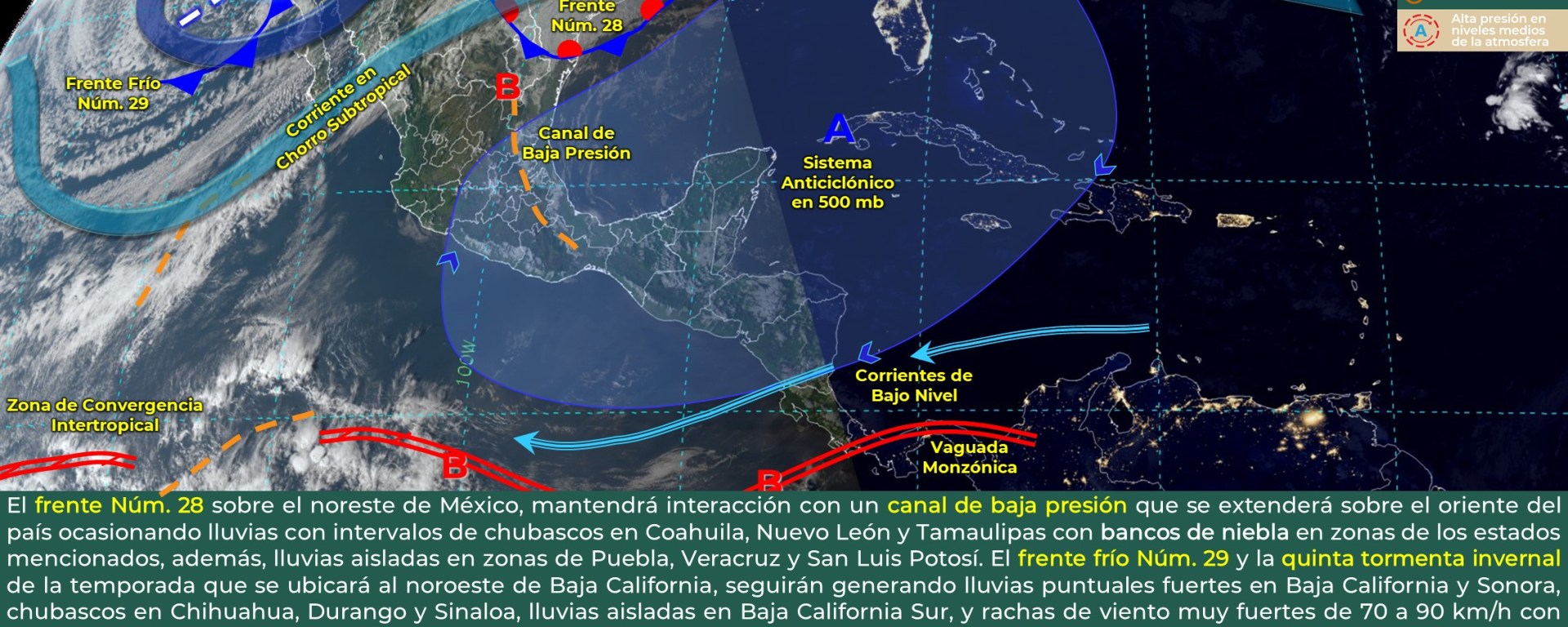 Cielo nublado con lluvias puntuales muy fuertes en zonas de Chihuahua y Durango, cielo medio nublado con lluvias fuertes en Coahuila, chubascos en Nuevo León y lluvias aisladas en Zacatecas y San Luis Potosí. Ambiente muy frío al amanecer, siendo gélido en sierras de Chihuahua y Durango. Ambiente templado y cálido por la tarde. Dominará viento de componente oeste de 15 a 30 km/h con rachas de 60 a 70 km/h y posibles tolvaneras en Chihuahua y Durango, así como de 40 a 60 km/h en Coahuila, Nuevo León, Zacatecas, Aguascalientes y San Luis Potosí.