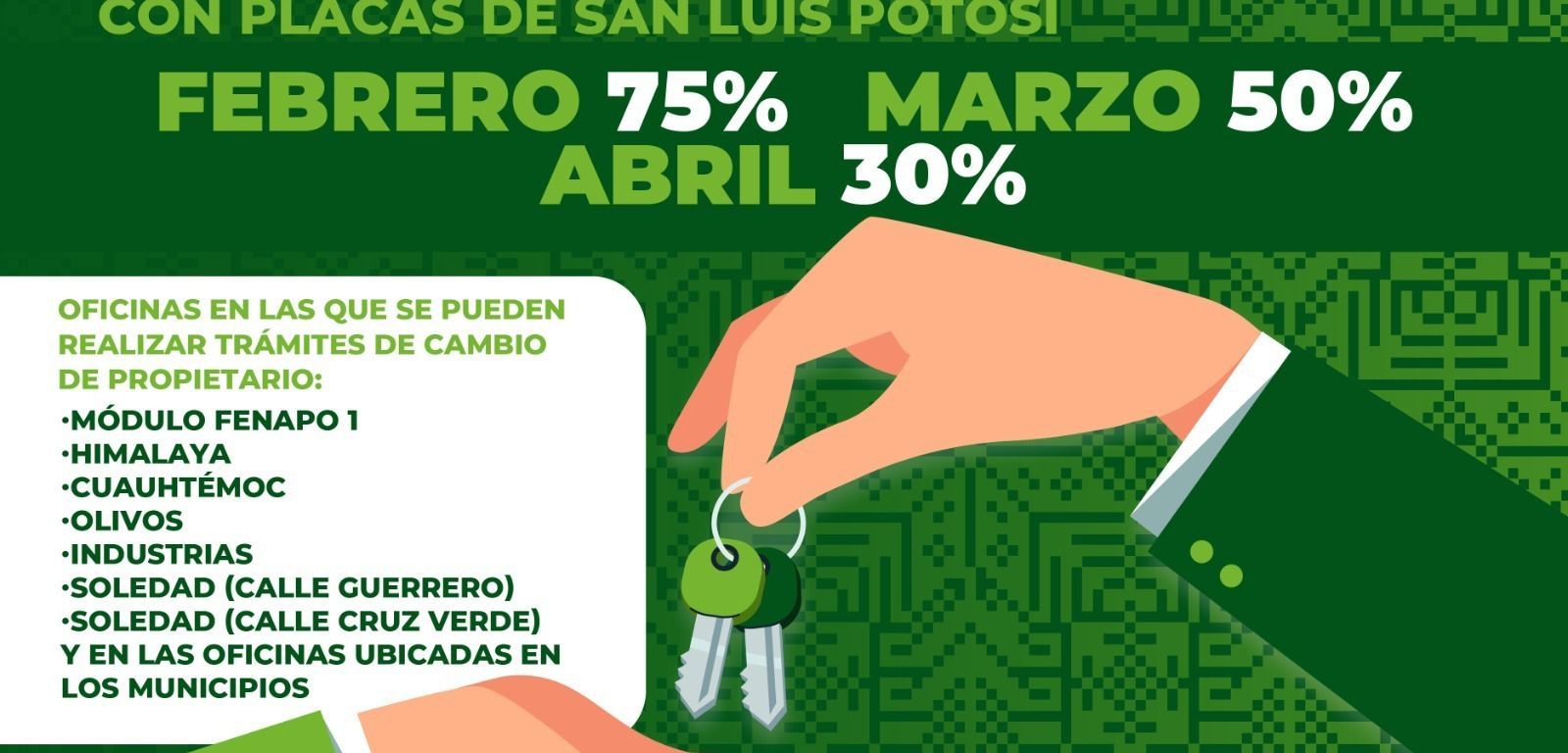 En una acción más para favorecer la economía de la ciudadanía potosina y brindar certeza legal a quien adquirió una unidad vehicular con placas de San Luis Potosí, y todavía no se encuentra a su nombre, de acuerdo con lo instruido por el Gobernador del Estado, Ricardo Gallardo Cardona, la Secretaría de Finanzas arrancó una campaña de descuentos en el trámite de cambio de propietario.
