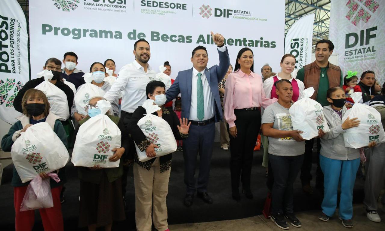 El Gobernador de San Luis Potosí, Ricardo Gallardo Cardona, refrendó su compromiso de trabajar las y los potosinos que más lo necesitan, con el arranque del programa de “Becas alimentarias 2023”, cuya meta para este año es alcanzar a las 600 mil familias beneficiarias, con el propósito de contribuir a mejorar las condiciones de igualdad de oportunidades para un desarrollo pleno de los hogares de las cuatro regiones de la entidad.