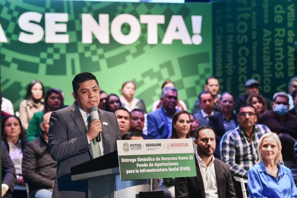 Cumpliendo un compromiso más con el bienestar de las y los potosinos, el Gobernador del Estado, Ricardo Gallardo Cardona, en un hecho histórico, entregó los recursos del Ramo 33 con incrementos cercanos al 20 por ciento para cada uno de los 58 municipios, de la participación que le corresponde a la entidad, con lo que se fortalecen los apoyos para atender las necesidades más urgentes en materia de infraestructura y servicios básicos, con una bolsa global de cinco mil 299 millones 410 mil 17 pesos.