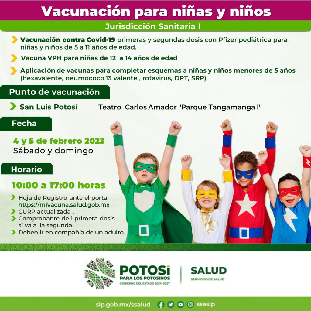 Personal de la Jurisdicción Sanitaria No. I de los Servicios de Salud estará este sábado 4 y domingo 5 de febrero aplicando primeras y segundas dosis contra Covid-19 a niñas y niños de 5 a 11 años de edad, está jornada de vacunación se realiza en el teatro Carlos Amador en el Parque Tangamanga I de las 10:00 a 17:00 horas; debe llevar registro del portal https://mivacuna.salud.gob.mx, CURP actualizada, si es para segunda dosis, el comprobante de la primera y deben ir en compañía de una persona adulta. No deje pasar la oportunidad de proteger a sus hijas e hijos contra el virus.