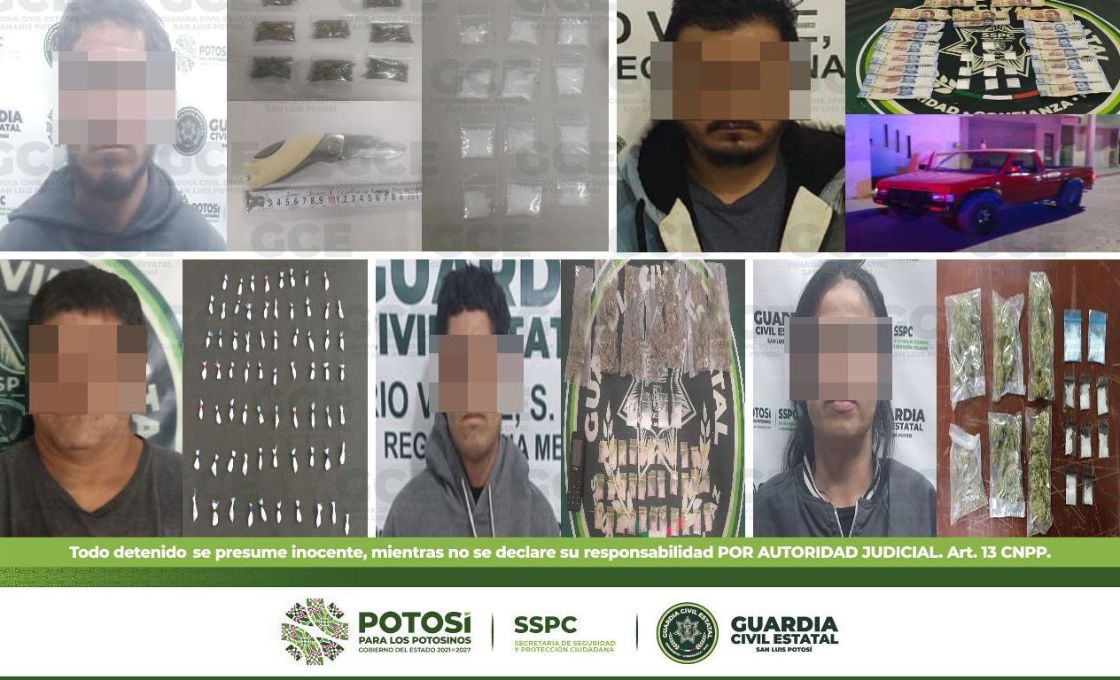 Dentro del Plan Integral de Seguridad que tiene como objetivo combatir los ilícitos, tales como el narcomenudeo y consumo de droga en la Entidad potosina, agentes de la Guardia Civil Estatal detuvieron a 5 presuntos narcomenudistas y se aseguraron más de 150 dosis de enervantes.