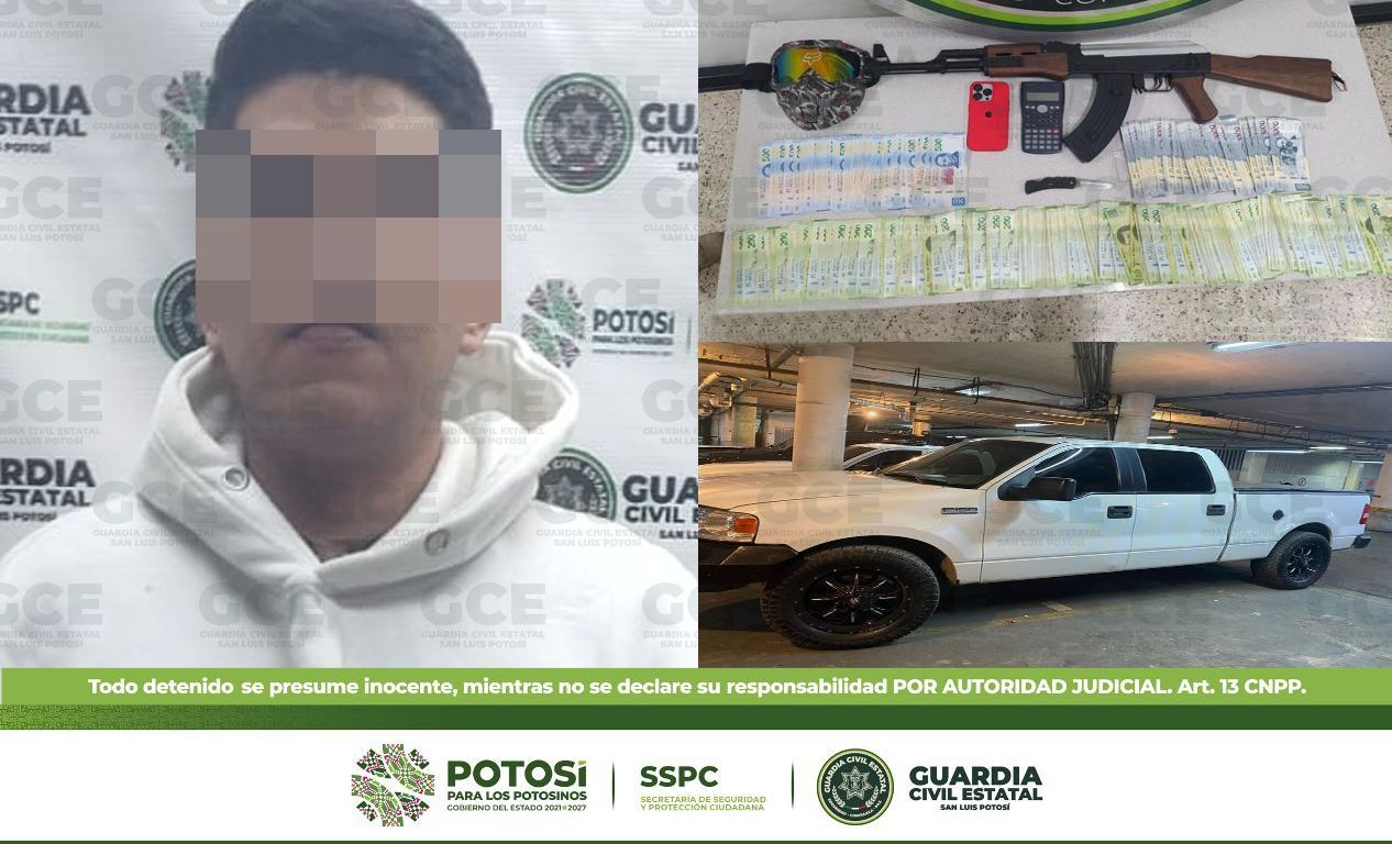Además, al momento de su detención se le aseguró una máscara, un equipo de telefonía celular y una calculadora. Derivado de los trabajos de análisis, dicha persona estaría supuestamente vinculada a delitos como la extorsión a negocios de la capital potosina.