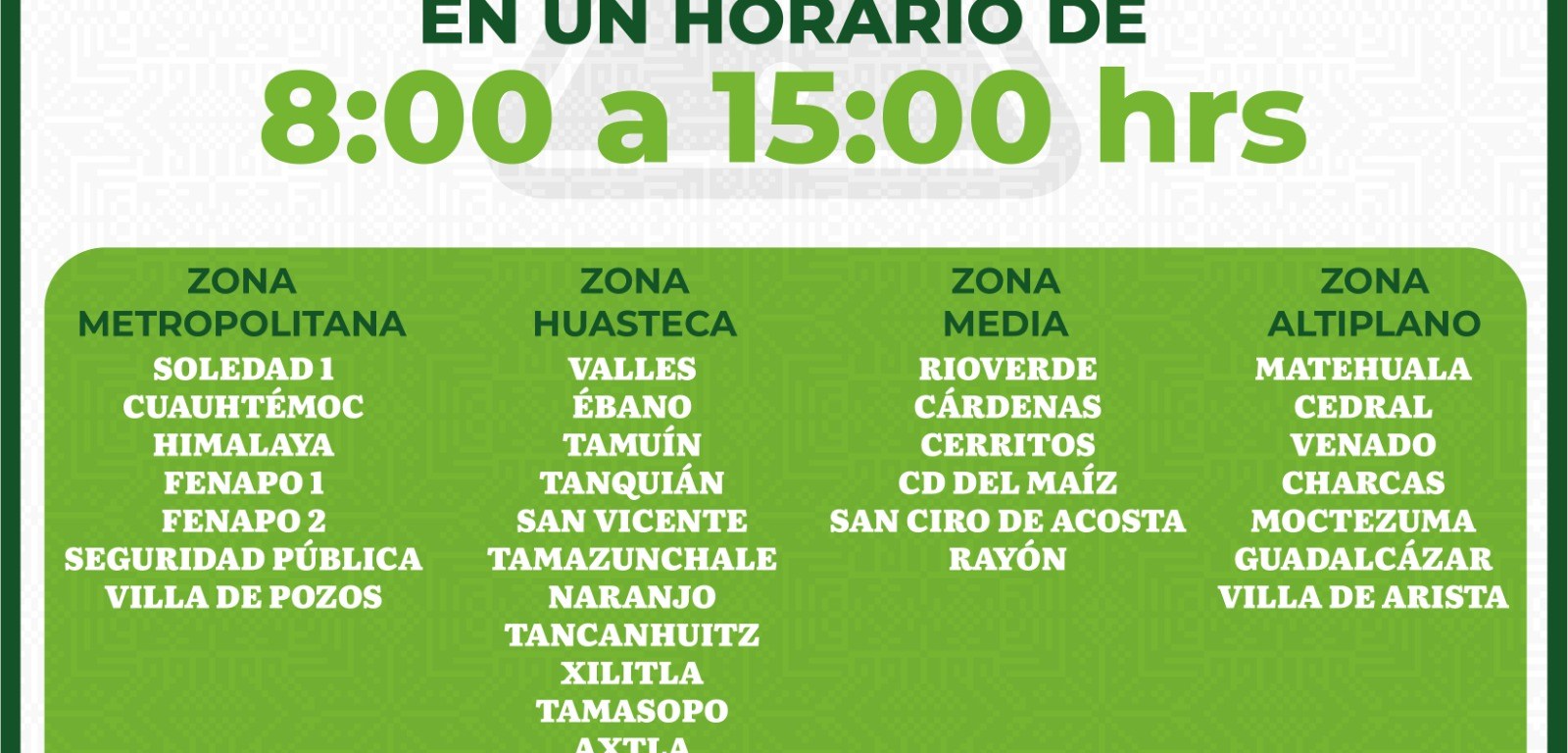 La dependencia estatal dio a conocer las oficinas que durante este lunes brindarán su servicio, en la zona metropolitana: Cuauhtémoc, Himalaya, Fenapo 1, Macromódulo (Fenapo 2), Seguridad Pública, Villa de Pozos y Soledad 1. En la zona Huasteca: Ciudad Valles, Ébano, Tamuín, Tanquián, San Vicente, Tamazunchale, El Naranjo, Tancanhuitz, Xilitla, Tamasopo, Axtla y Aquismón.
