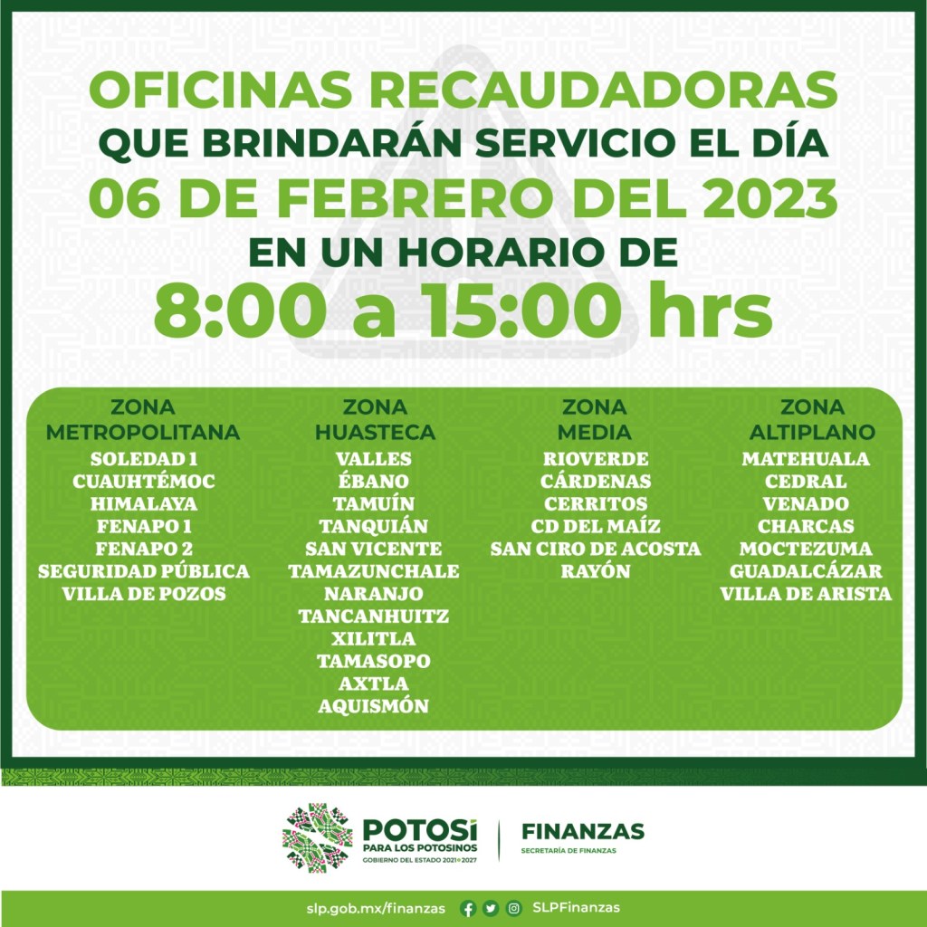 En cumplimiento a lo instruido por el Gobernador de San Luis Potosí, Ricardo Gallardo Cardona, de garantizar la atención a las y los potosinos, todos los días del año, incluidos los días festivos y de asueto, sin vulnerar los derechos de las y los trabajadores del Estado, la Secretaría de Finanzas (Sefin) mantendrá activas este lunes 6 de febrero, 32 oficinas recaudadoras en la zona metropolitana y al interior de la entidad, para que la ciudadanía pueda acudir a realizar sus trámites.
