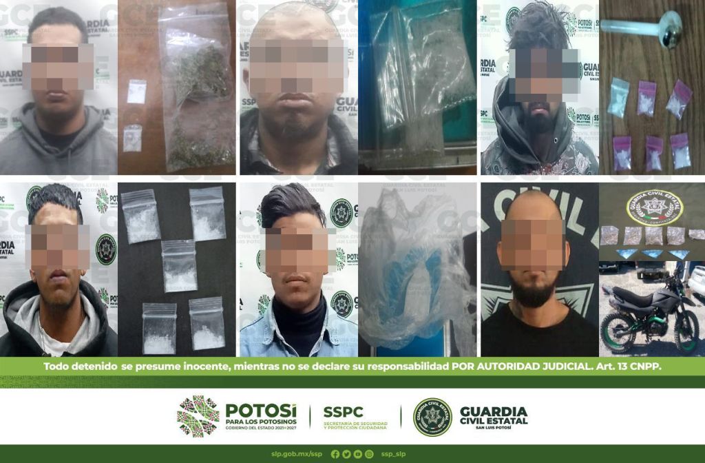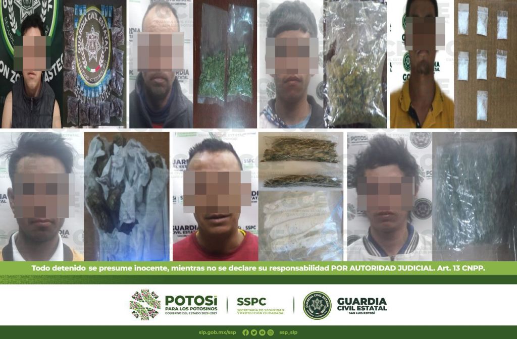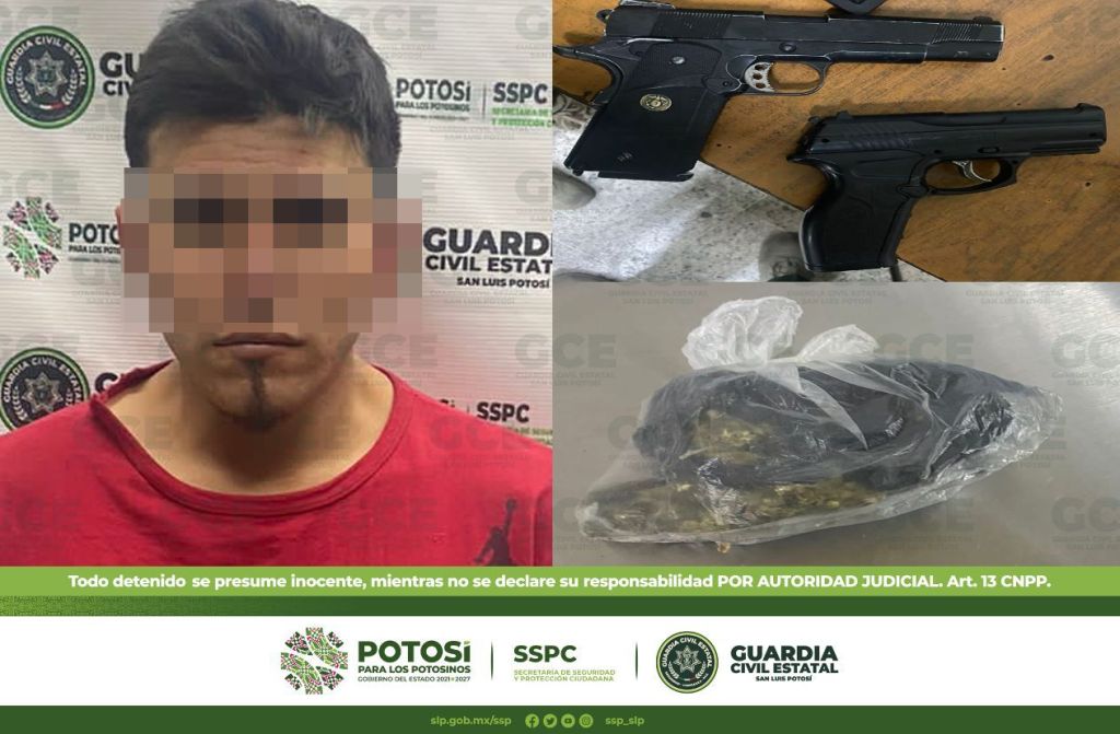 En el municipio de Soledad de Graciano Sánchez, fueron detenidos tres masculinos: el primero de ellos, en la colonia Villa de Cactus, tratándose de Alan de 22 años de edad a quien se le aseguró una dosis de marihuana; sobre la colonia Rivas Guillén, fue detenido Juan de 27 años con cinco dosis de “cristal”; también, en la colonia Genovevo Rivas Guillén, fue detenido Oscar de 25 años con una bolsa que contenía marihuana, además se le aseguraron dos réplicas de arma de fuego.