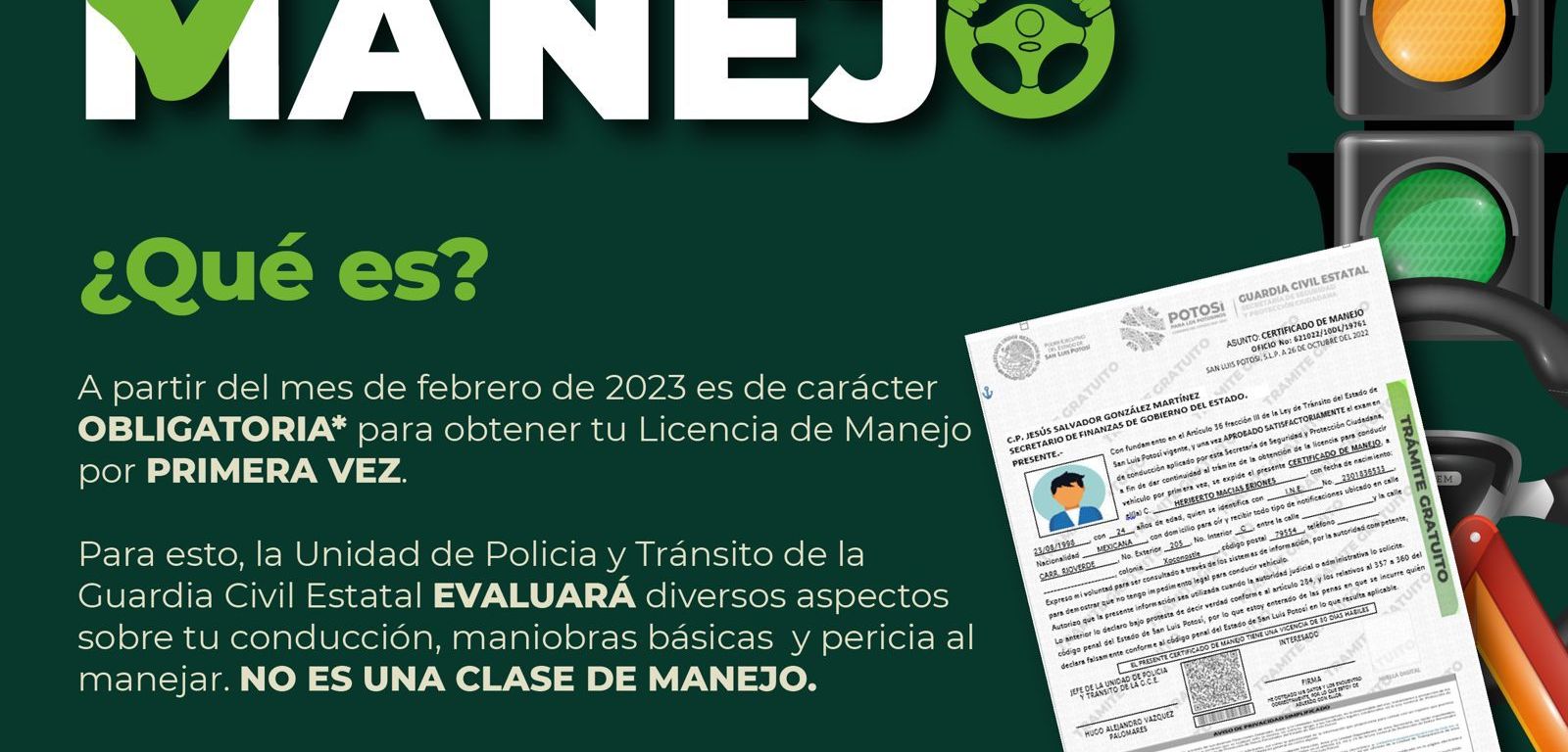 El trámite será gratuito y de manera paulatina, y acreditará aptos para conducir una unidad motora; posteriormente podrán tramitar su licencia de conducir. Sólo aplicará para trámite de primera vez.