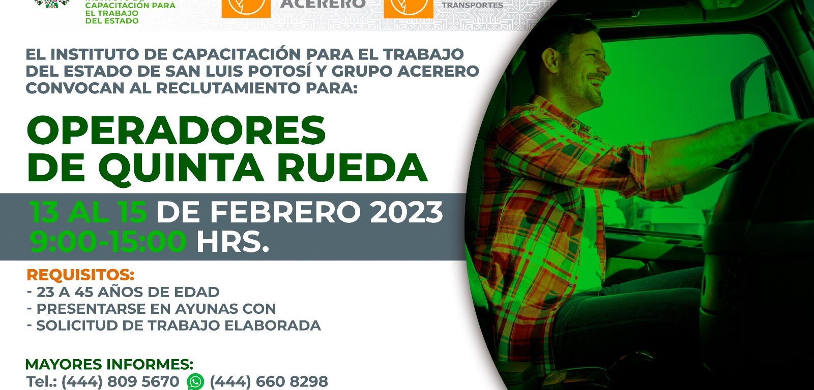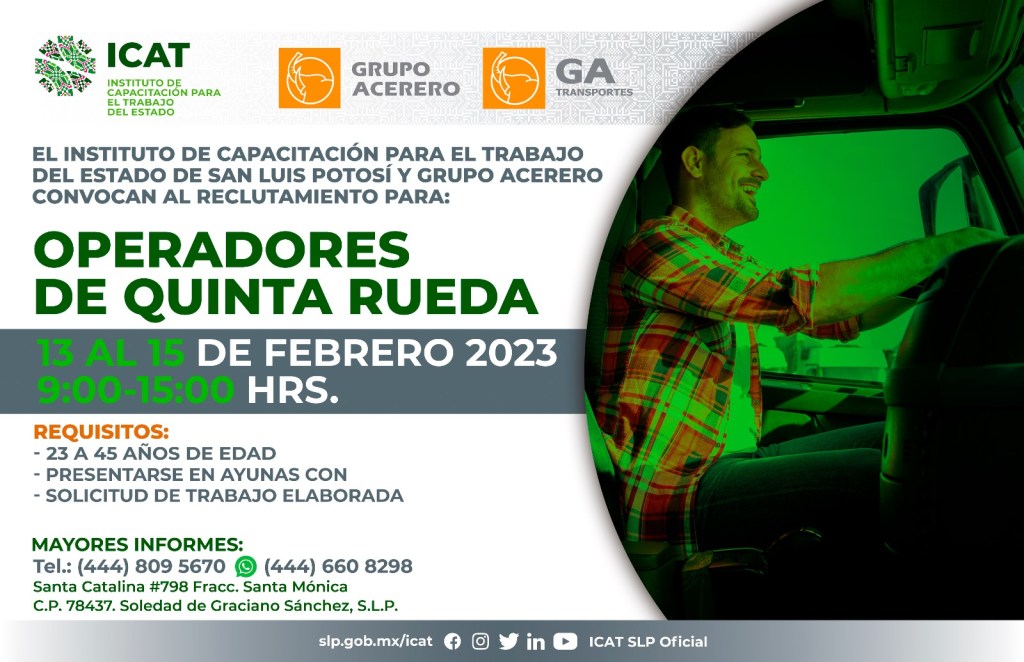 El Gobierno del cambio, firme en el objetivo de abonar al fortalecimiento laboral de las y los potosinos, como lo ha definido el Gobernador de San Luis Potosí, Ricardo Gallardo Cardona, el Instituto de Capacitación para el Trabajo (Icat) y la empresa potosina, Grupo Acerero, en su división logística GA Transportes, convocan al inicio del proceso de reclutamiento de operadoras y operadores de quinta rueda, quienes recibirán la formación y certificación oficial así como un puesto laboral en esta importante empresa.