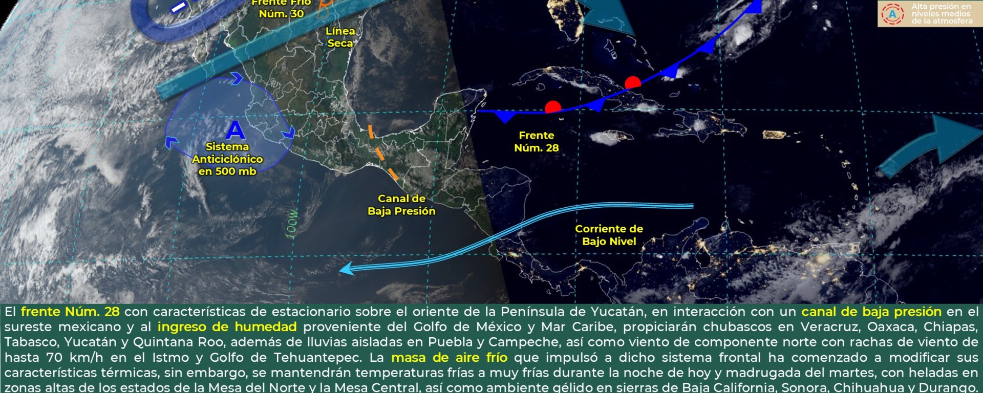 Temperaturas mínimas de -5 a 0 °C con heladas: zonas montañosas de Nuevo León, San Luis Potosí, Zacatecas, Aguascalientes, Jalisco, Guanajuato, Estado de México, Hidalgo, Tlaxcala, Puebla y Veracruz.