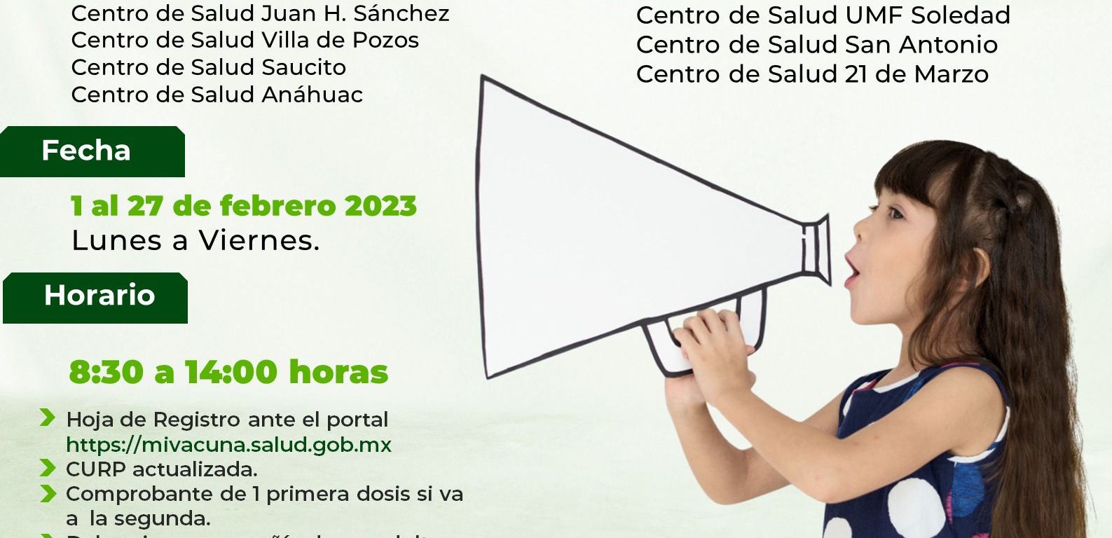 Los Servicios de Salud continúan aplicando primeras y segundas dosis de Pfizer pediátrica a niñas y niños de 5 a 11 años de edad, para proteger a sus hijas e hijos se requiere que les lleve a recibir el biológico; en la capital la campaña estará de lunes a viernes hasta el 27 de febrero, de 8:30 a 14:00 horas en los centros de salud Juan H. Sánchez, Villas de Pozos, Saucito y Anáhuac; en Soledad de Graciano Sánchez en la Unidad de Medicina Familiar Soledad, centros de salud San Antonio y 21 de marzo.