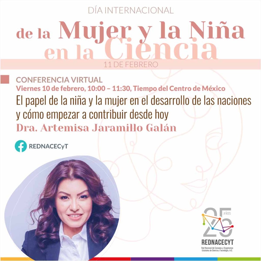 Para el 10 de febrero a las 10 horas (Tiempo del Centro) se llevará a cabo la conferencia, El papel de la niña y la mujer en el desarrollo de las naciones y cómo empezar a contribuir desde hoy, que impartirá Artemisa Jaramillo Galán, directora de Mercadotecnia Digital para Mirai Innovation Japón, quien ha recibido la distinción “QS Reimaginando la Educación” de la Universidad de Wharton y es directora fundadora de la iniciativa nacional de alfabetización digital en conjunto con la Autoridad Saudita.
