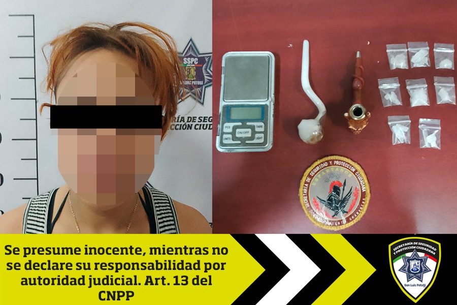 Como resultado de patrullajes de prevención y seguridad sobre el cuadrante sur de la ciudad, agentes de Guardia Municipal de la Secretaría de Seguridad y Protección Ciudadana (SSPC), detectaron a una persona de sexo femenino que se encontraba consumiendo enervantes y en revisión preventiva de seguridad le fueron encontradas diversas dosis de droga, además de una gramera y una pipa de cristal, motivo por el que fue puesta a disposición de la autoridad ministerial para el deslinde de responsabilidades.