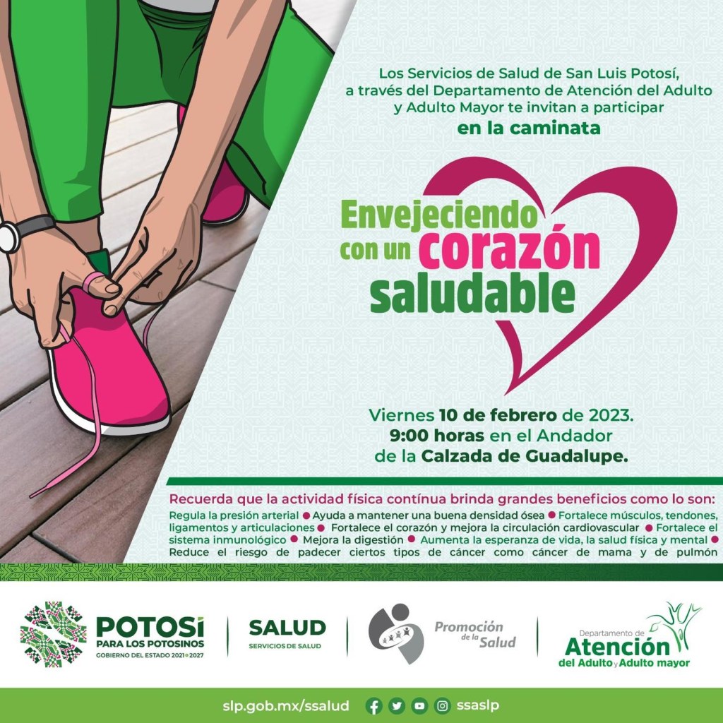 La caminata “Envejeciendo con un corazón saludable”, se realizará el próximo viernes 10 de febrero en punto de las 9:00 de la mañana, reuniendose para la salida en la fuente del Santuario de la Basílica de Guadalupe, no olvides invitar a tus amigos, vecinos y familiares y acudir con ropa cómoda y bien hidratados para comenzar juntos una vida más saludable. ¡Te esperamos!