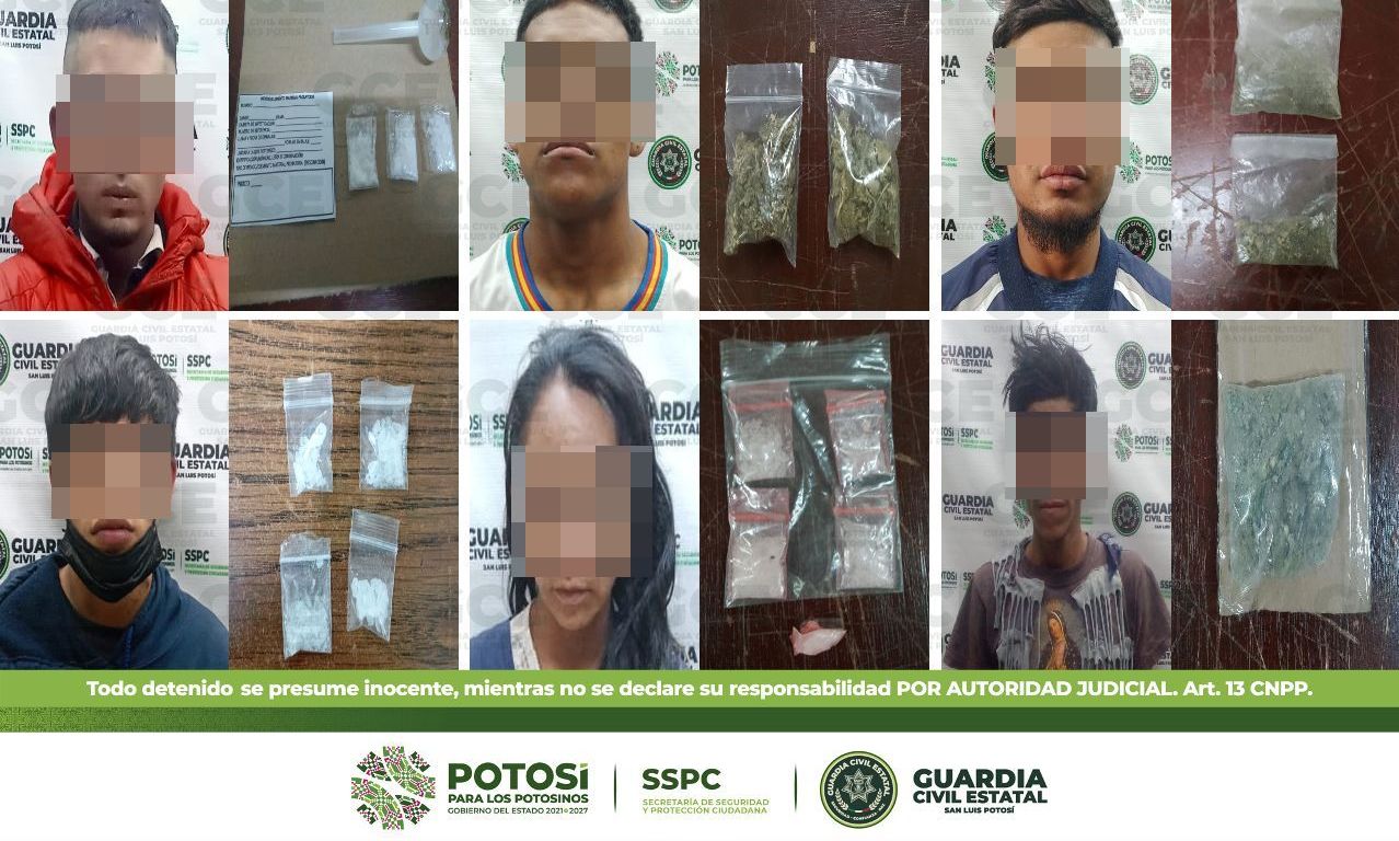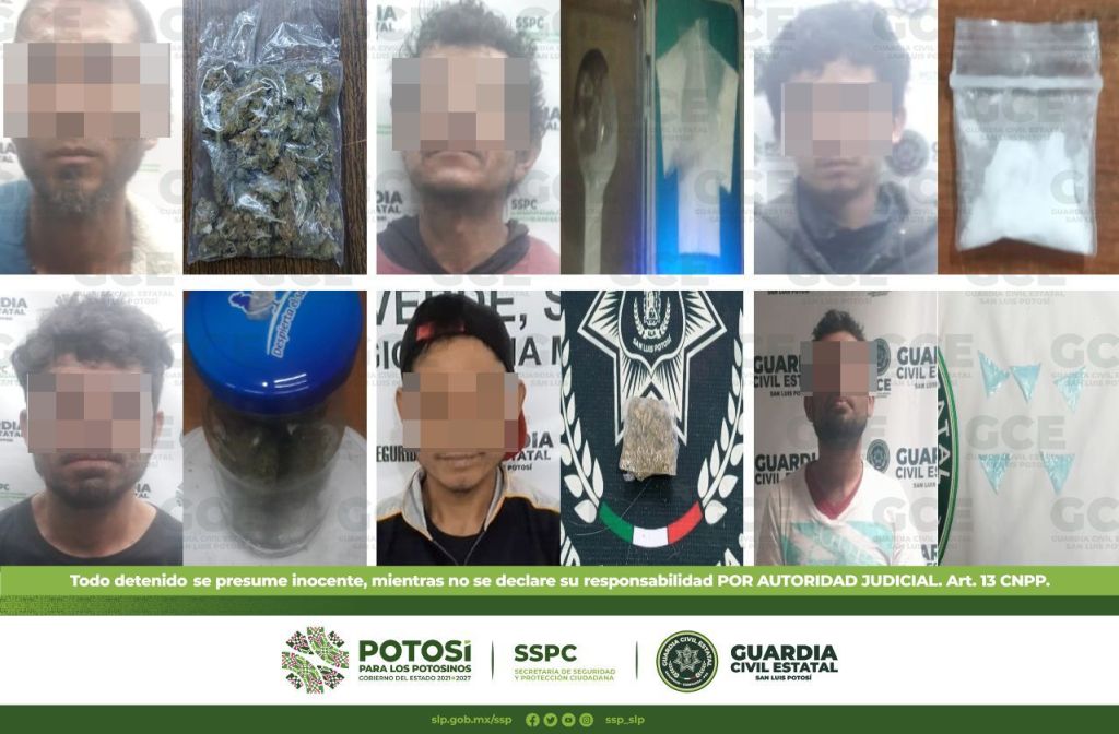 Derivado de los permanentes operativos de seguridad y vigilancia realizados en todo el territorio potosino, 18 personas resultaron detenidas por la Guardia Civil Estatal (GCE) por el probable delito de posesión de droga.