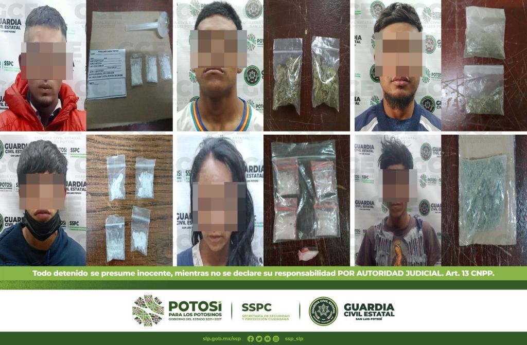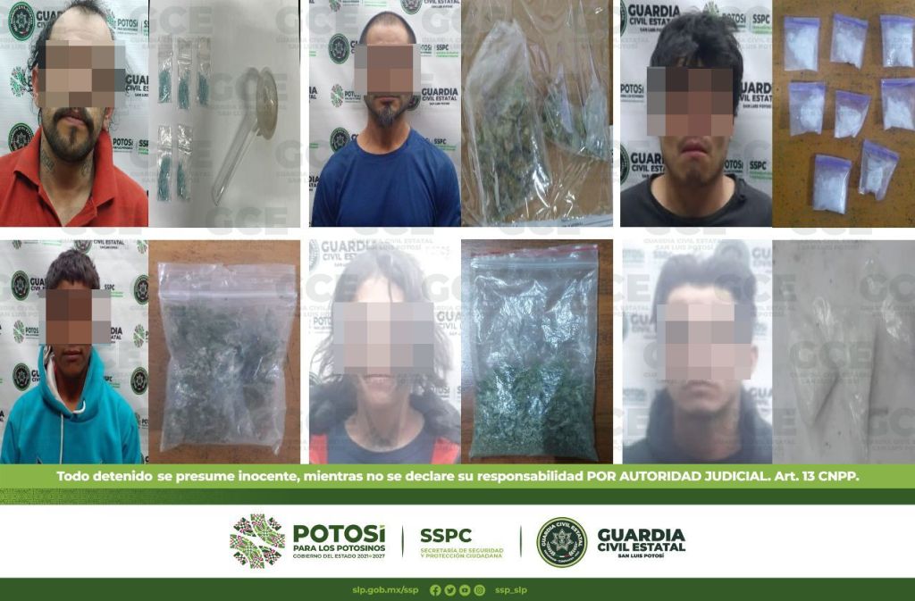 En el municipio de Soledad de Graciano Sánchez, fueron detenidas 6 personas: la primera de ellas en la colonia San Antonio, tratándose de José de 19 años de edad a quien se le aseguraron cuatro dosis de “cristal”; en la zona centro, fue detenida María de 38 años de edad con cinco dosis de “cristal”; en el fraccionamiento La Herradura, la GCE detuvo a Víctor de 27 años con una dosis de marihuana.