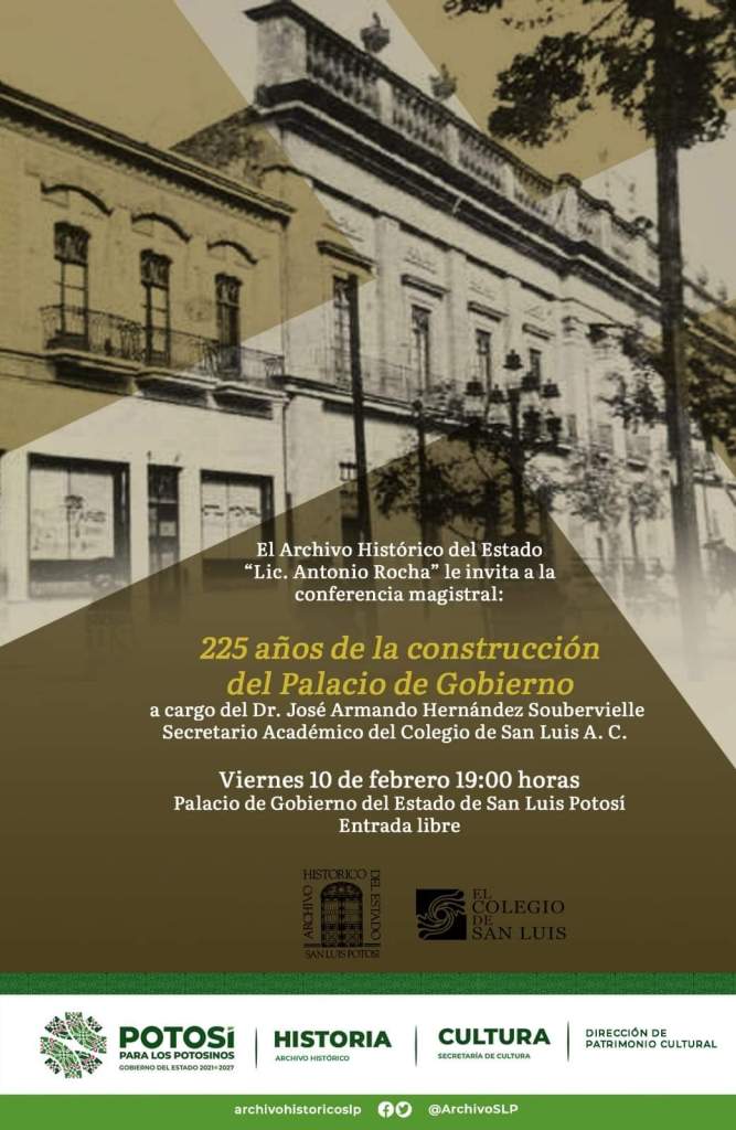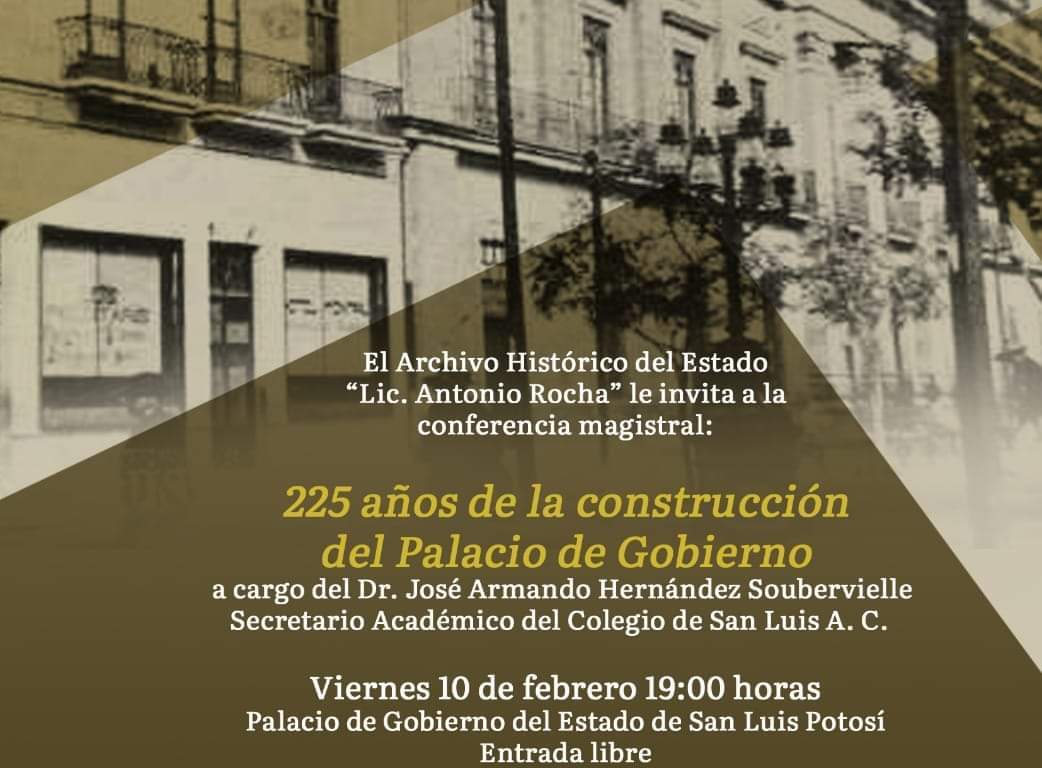Para conmemorar el 225 aniversario del inicio de la construcción del Palacio de Gobierno de San Luis Potosí, cuyo edificio histórico potosino fue la estancia provisional del Presidente de la República Benito Juárez, además de antiguas casas reales y cuartel militar, el Archivo Histórico del Estado, por instrucción del Gobernador del Estado Ricardo Gallardo Cardona, ha programado una conferencia magistral por parte del investigador Armando Hernández Soubervielle, actual secretario académico del Colegio de San Luis.
