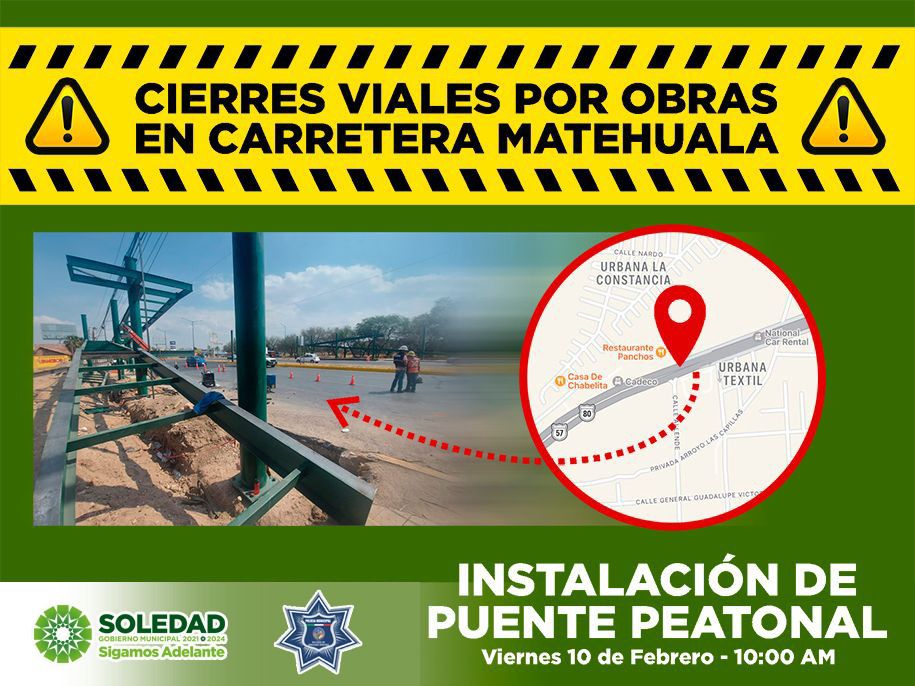La Dirección de Tránsito y Policía Vial de Soledad de Graciano Sánchez, informa que se llevará a cabo el cierre de la carretera Matehuala, este viernes 10 de febrero a partir de las 10:00 am.