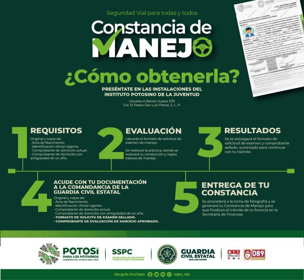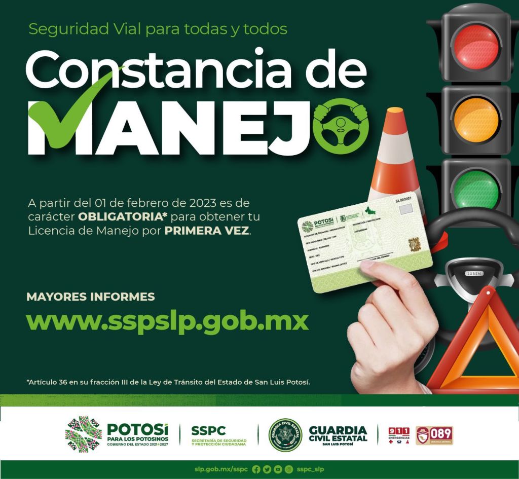 Para incentivar en las y los conductores potosinos el reforzamiento de una cultura y educación en seguridad vial, el Gobernador de San Luis Potosí, Ricardo Gallardo Cardona, exhortó a cumplir y obtener la constancia de manejo, como requisito indispensable en el trámite de licencias de conducir por primera vez, coadyuvando a que cuenten con las habilidades necesarias frente al volante, cuidar su vida e integridad de todas y todos.