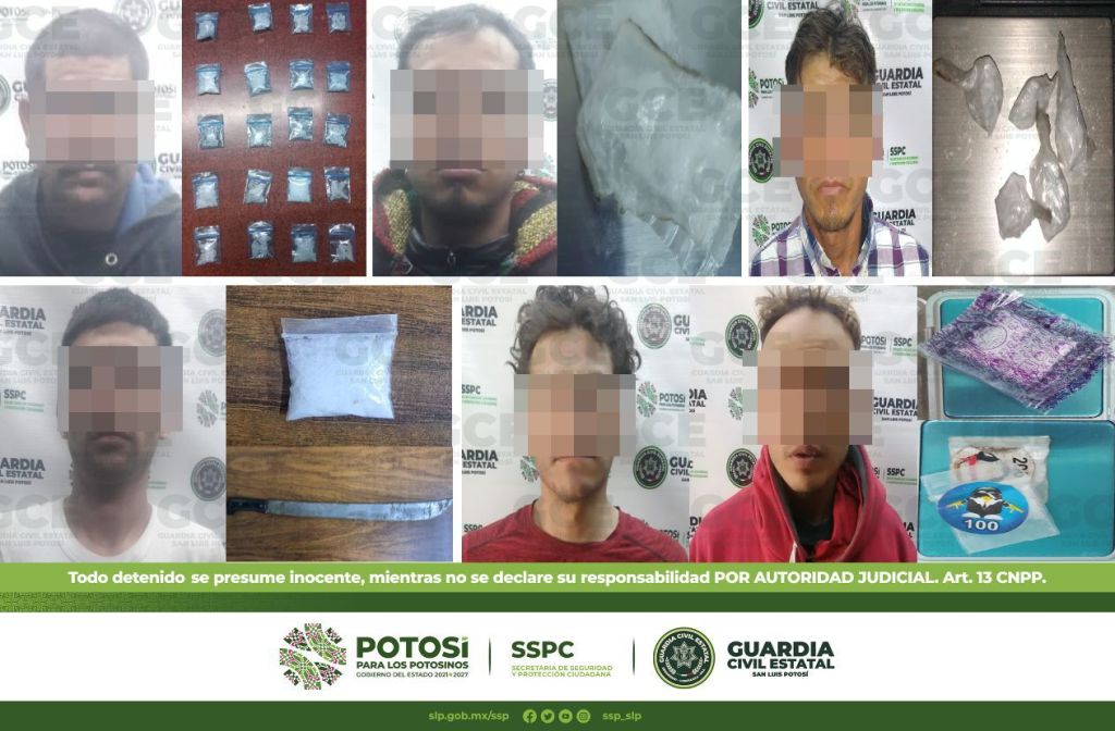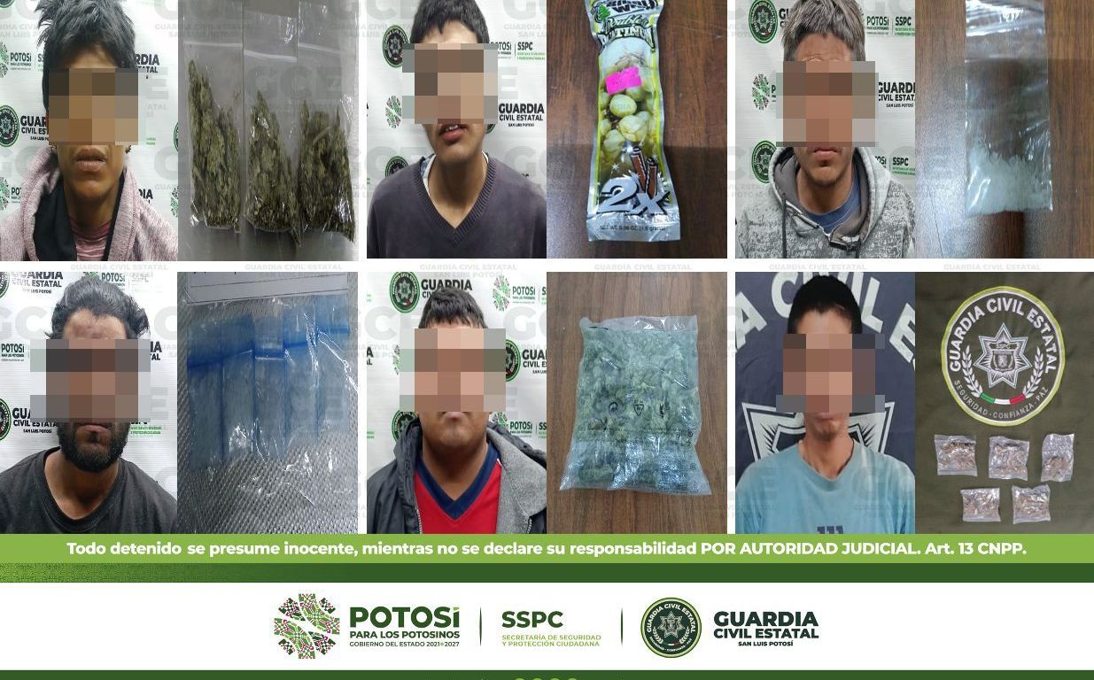 En el interior del Estado, la Guardia Civil Estatal detuvo a cuatro sujetos: uno de ellos en la colonia Vista Hermosa, perteneciente al municipio de Ciudad Valles, tratándose de José de 24 años de edad, a quien se le aseguraron cinco dosis de marihuana; en la colonia Hidalgo, en el municipio de Tamuín, fue detenido Juan de 33 años con cuatro dosis de “cristal” y una pipa; durante los dispositivos emitidos en el municipio de Rioverde, en la colonia San Rafael, fue detenido Enrique de 47 años con una dosis de marihuana; por último, en la calle Gabriel G. Márquez, en el municipio de Matehuala, resultó detenido Pedro de 23 años al asegurarle tres dosis de marihuana.