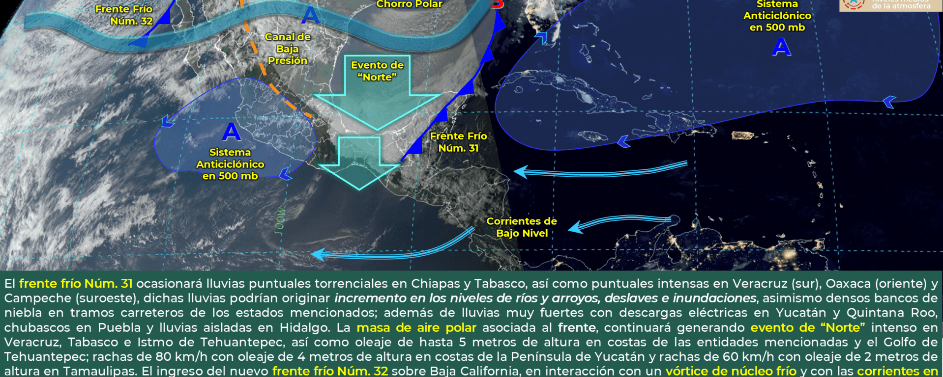 Evento de “Norte” con rachas de 100 a 120 km/h: Istmo y Golfo de Tehuantepec; y conrachas de 40 a 60 km/h durante la mañana: Campeche, Yucatán y Quintana Roo.
