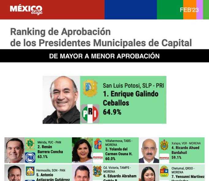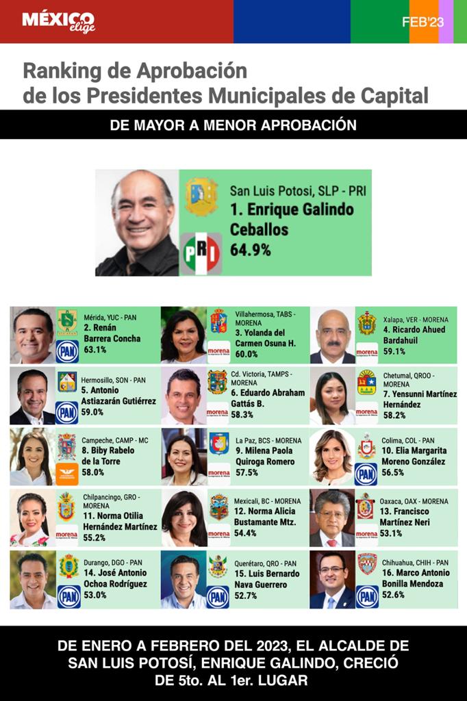 En el ranking de aprobación de presidentes municipales de capitales del país, el alcalde de San Luis Potosí, Enrique Galindo Ceballos, escaló al primer lugar en la evaluación hecha por la organización México Elige, correspondiente al mes de febrero.