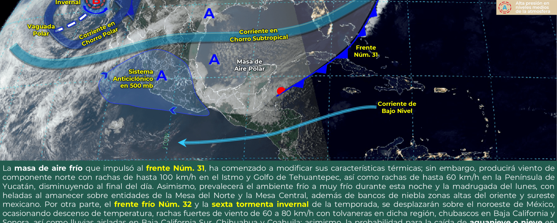 Viento con rachas de 40 a 60 km/h: Baja California Sur, Aguascalientes, Jalisco, Guanajuato, San Luis Potosí, Tabasco, Campeche y Yucatán.