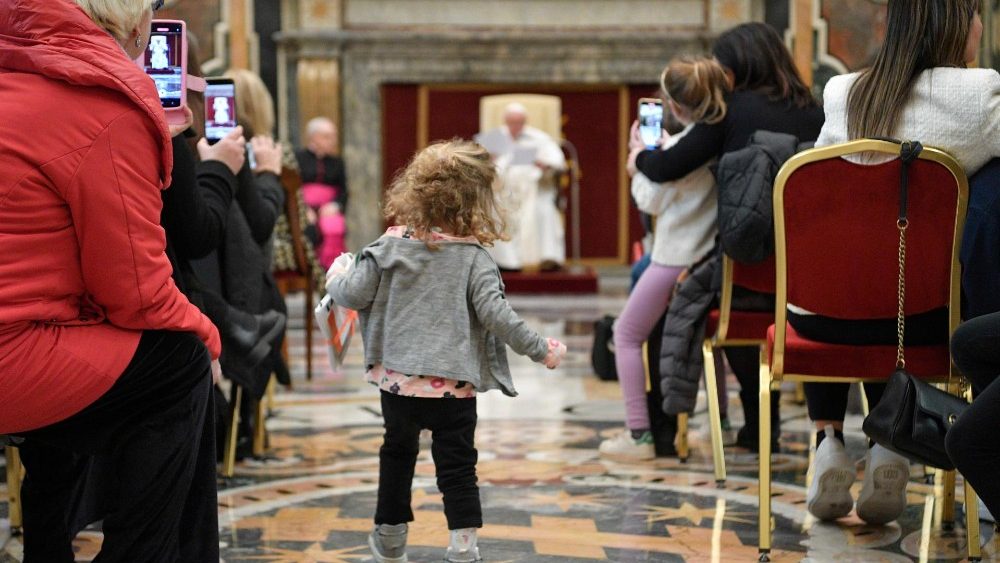Mientras pronunciaba su discurso, el Papa fue interrumpido por una niña que se le acercó y le entregó un regalo: «¡Ven, ven, ven! ¿Esto es para mí? Y tú eres buena: ¡buena! Esta es la inocencia creativa de los niños: son lo que son y hacen». Luego le siguió otra niña, y otros y otros, hasta que el Papa estuvo rodeado de pequeños. ‘Tú vienes a mí, tú vienes también: otra buena… Y podemos darles estos dos rosarios, traigan dos rosarios blancos, dos blancos’, dijo, añadiendo: “Esto es mejor que el discurso, ¿eh? Este es su discurso, esta espontaneidad …”. Francisco se entretuvo entonces con los pequeños, a los que se unieron otros adultos enfermos. Les preguntó sus nombres – Emanuele, Samuel, Carla, Darío – y repartió los rosarios, distribuyó caricias y bendiciones. Como a una mujer que le dijo: «Te pido una oración por mi diagnóstico, que aún no hemos encontrado».