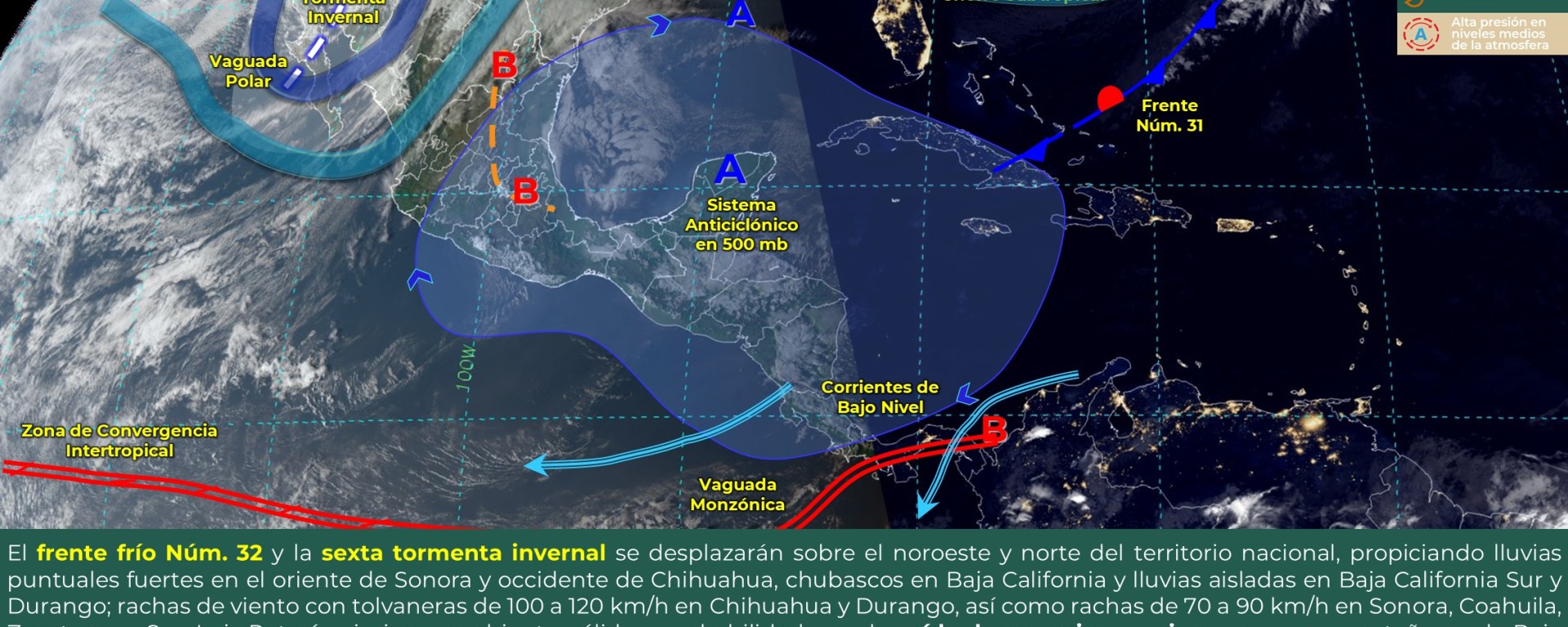 Viento con rachas de 70 a 80 km/h: Golfo de California, y con tolvaneras: Durango y Coahuila.
