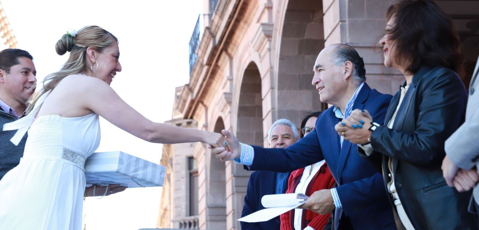 Más de 130 parejas potosinas contrajeron matrimonio este 14 de febrero a través del programa «Da el SÍ por la familia» del Sistema Municipal DIF de San Luis Potosí. En la Plaza de Armas, frente al Palacio Municipal, las parejas de diversas edades formalizaron su relación en una ceremonia encabezada por la Presidenta del DIF Municipal, Estela Arriaga Márquez y el Alcalde Enrique Galindo Ceballos, acompañados por la jueza del Registro Civil No. 14, María Silvestre Saldaña Hernández.
