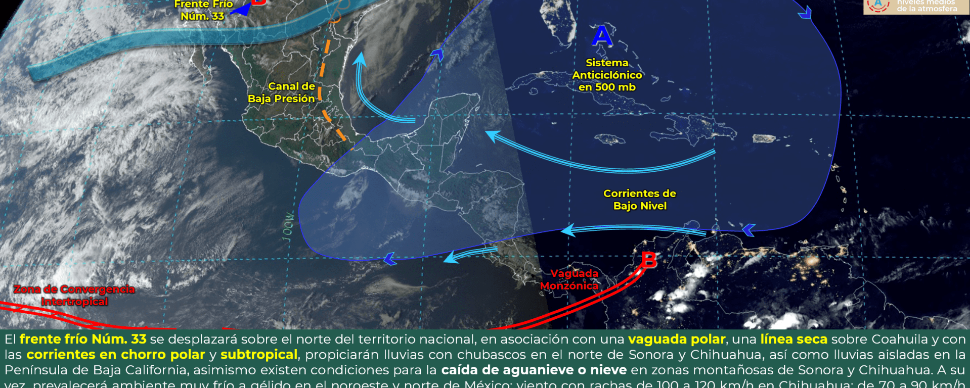 Viento con rachas de 40 a 50 km/h y posibles tolvaneras: Baja California Sur, Sonora, Chihuahua, Durango, Zacatecas, San Luis Potosí y Jalisco.