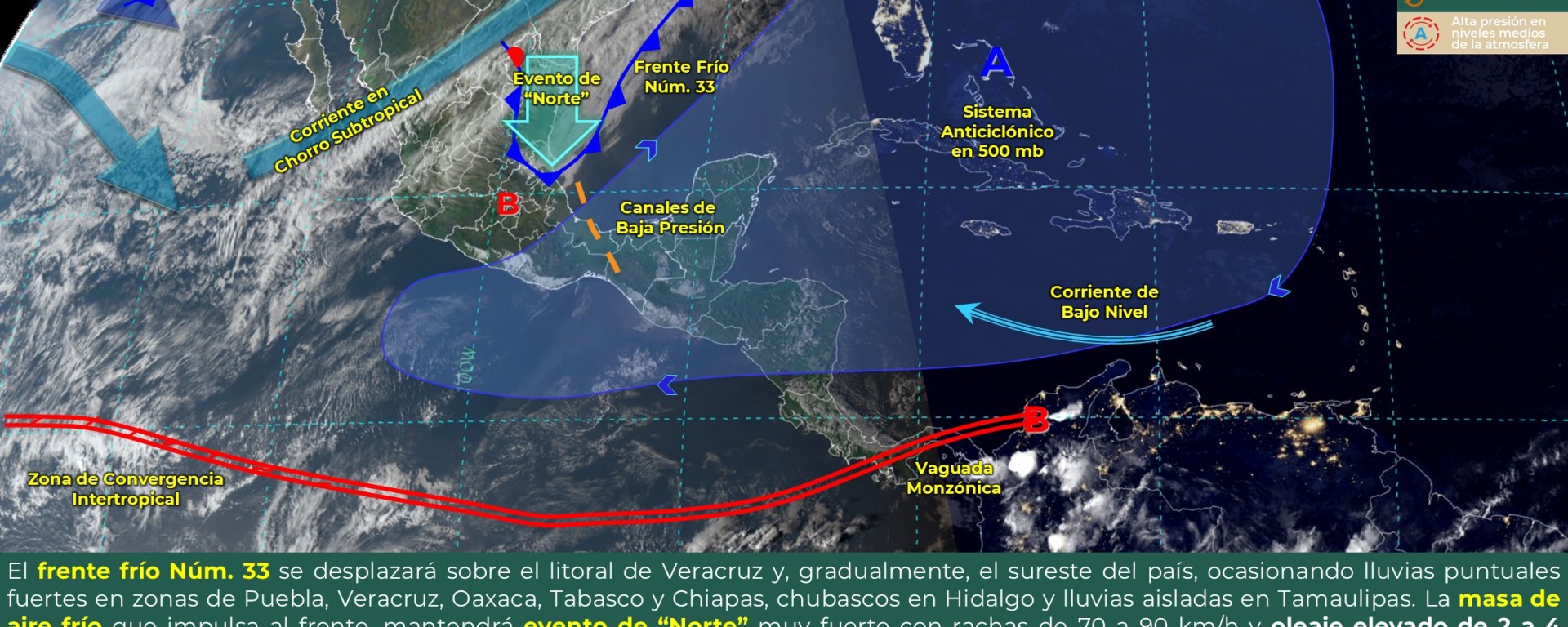 Evento de “Norte” con rachas de viento de 100 a 120 km/h: Istmo y Golfo de Tehuantepec, con rachas de 80 a 100 km/h: Veracruz y Tabasco, y con rachas de 60 a 80 km/h: Tamaulipas, Campeche y Yucatán.