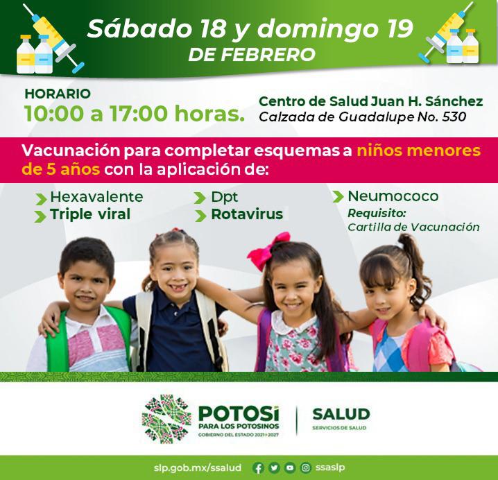 La jefa del departamento de Vacunología de los Servicios de Salud, Esmeralda Vanegas Santana, dijo que la jornada de vacunación se efectuará el sábado 18 y el domingo 19 de febrero de 10:00 a 17:00 horas en el Centro de Salud Juan H. Sánchez ubicado en Calzada de Guadalupe No. 530, y habrá vacunas Hexavalente, Triple Viral, Dpt, Rotavirus y Neumococo, para niñas y niños menores de cinco años, por lo que pidió a las familias que acudan con la Cartilla de Vacunación de las y los menores y les completen sus esquemas de vacunación.