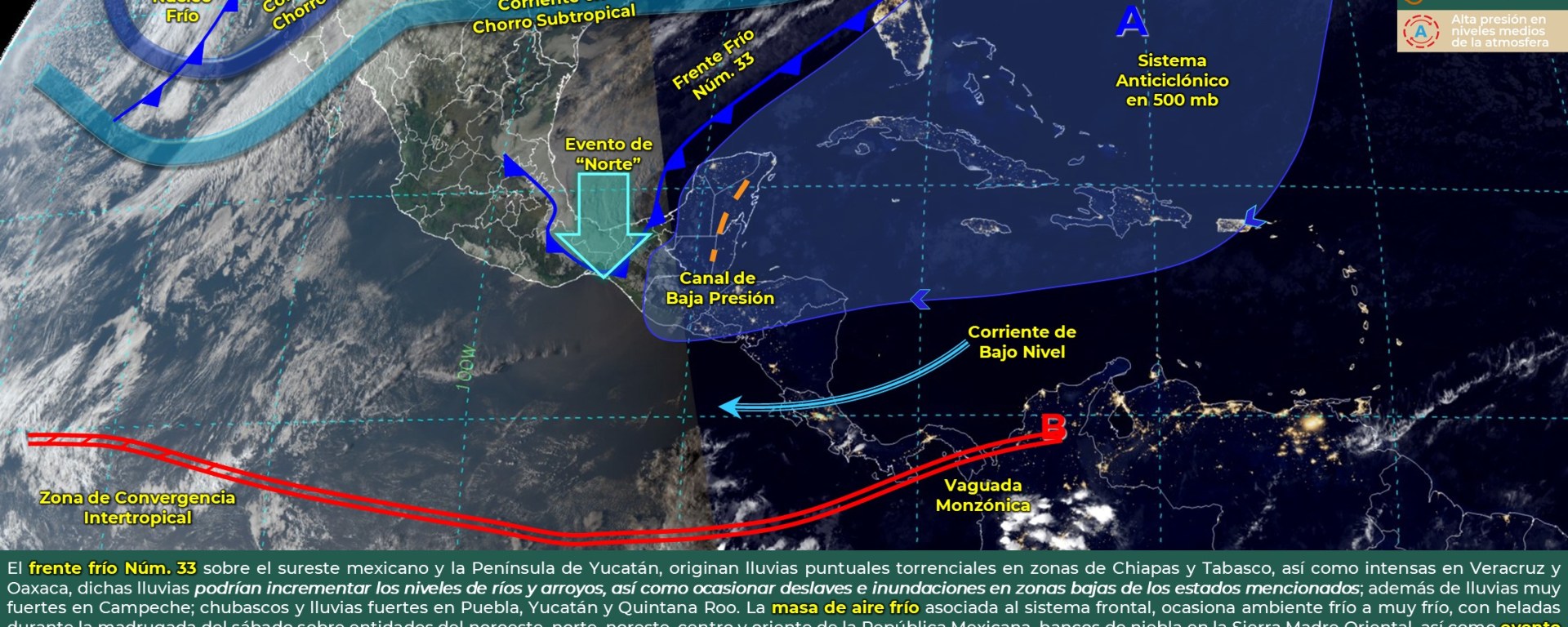 Evento de “Norte” con rachas de viento de 90 a 110 km/h: Istmo y Golfo de Tehuantepec, con rachas de 60 a 80 km/h: Veracruz y Tabasco, y con rachas de 50 a 60 km/h: Campeche y Yucatán.