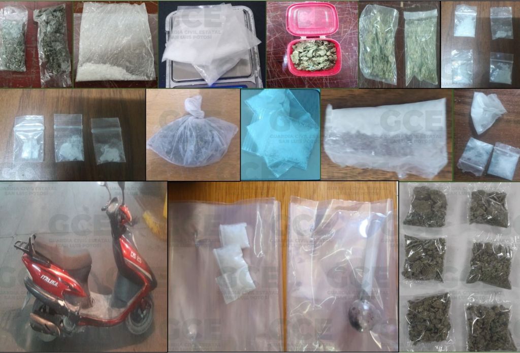 Continuando con los operativos en la delegación Villa de Pozos, fue detenida Rosa de 36 años con tres dosis de “cristal”; a su vez, en la colonia Barrio Vergel, resultó detenido José de 34 años con una dosis de marihuana; también, en la colonia Simón Díaz, Jonathan de 27 años y Misael de 36 años con 7 dosis de “cristal”; otro de los hechos ocurrió en la colonia Las Trancas, ahí fue detenido Ricardo de 30 años con dos dosis de marihuana y una motocicleta marca Italika, color rojo, sin placa.