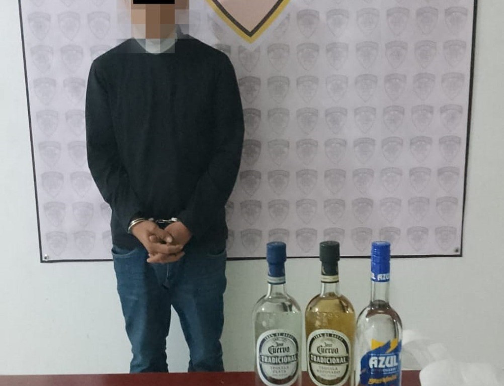 El hombre fue inspeccionado, encontrándole un cuchillo tipo cocina en la cintura y tres botellas de tequila, así como 710.50 pesos en monedas de diferentes denominaciones dentro de la bolsa de plástico.