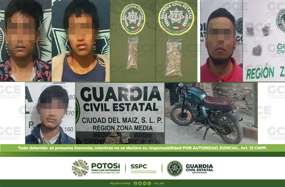 Al interior del Estado, en el municipio de Ciudad Valles, resultaron detenidos Juan de 21 años de edad y José de 24 años, tras asegurarles dos dosis de marihuana; de igual manera, en el municipio de Alaquines, fue detenido Eliseo de 19 años sobre el Barrio de San José, después de que los elementos estatales le aseguraran cuatro dosis de marihuana y una motocicleta en la que se desplazaba.