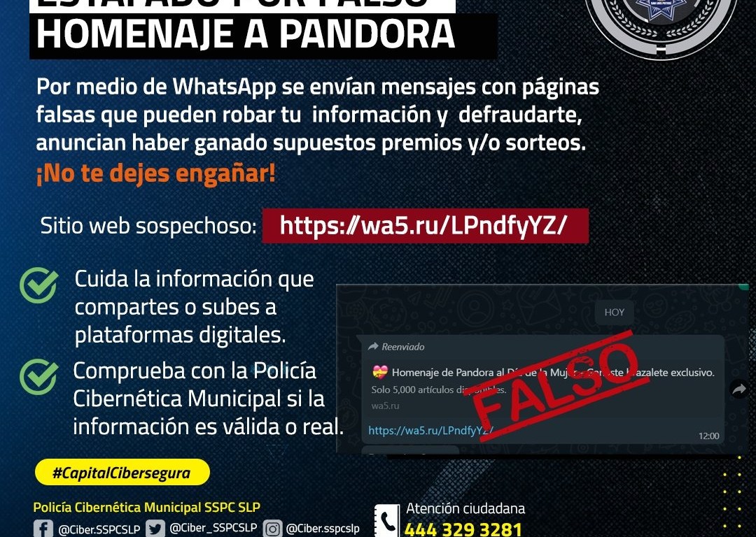 La Jefatura de Policía Cibernética Municipal de la Secretaría de Seguridad y Protección Ciudadana (SSPC) ha detectado un sitio web peligroso que se dedica al robo de identidad. Este sitio, denominado «Homenaje de Pandora», se distribuye a través de WhatsApp y aparenta ser un premio para los usuarios.
