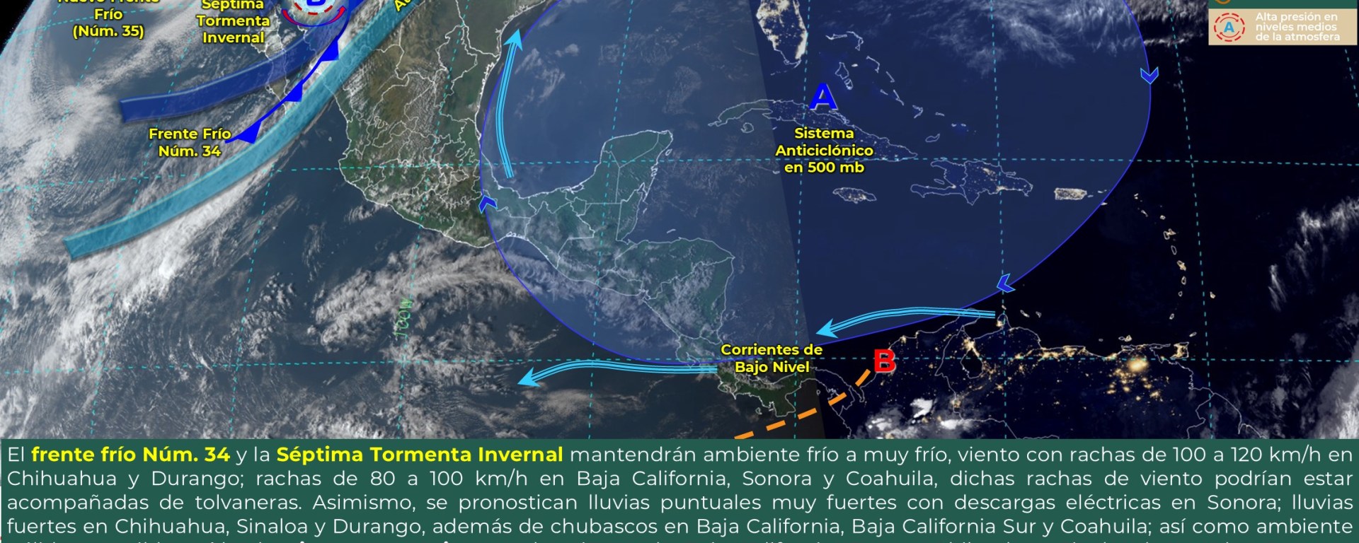 Viento con rachas de 100 a 120 km/h y tolvaneras: Baja California, Sonora, Chihuahua y Durango.
