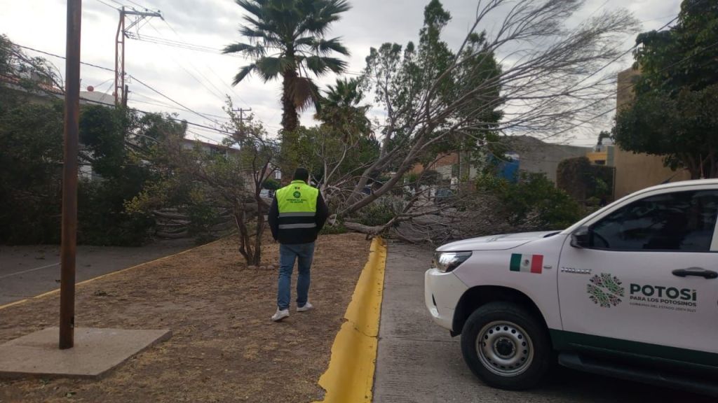Ordaz Flores detalló que personal de la dependencia en conjunto con Protección Civil de la Capital y Soledad de Graciano Sánchez y con las direcciones de Parques y Jardines, así como Bomberos, atienden reportes de caída de árboles y cables de luz en la zona metropolitana.