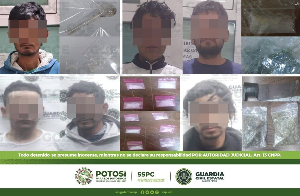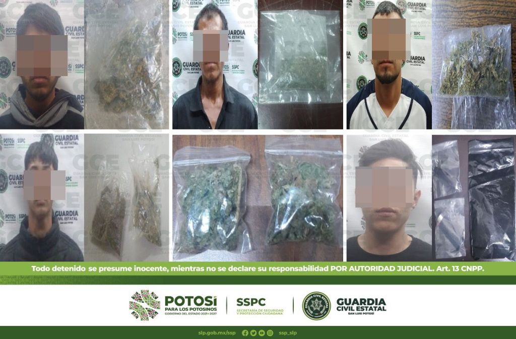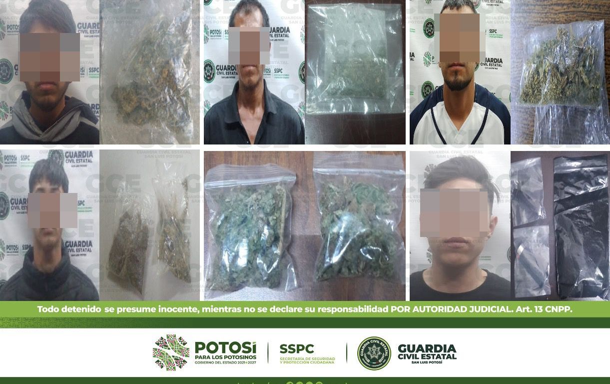 Otro de los hechos ocurrió en la delegación Villa de Pozos, tratándose de Saúl de 38 años de edad a quien se le aseguró una bolsa con marihuana; en la colonia Los Magueyes, resultó detenido Jesús de 36 años con una dosis de marihuana; también, en la colonia Colinas del Parque, fue detenido Abraham de 19 años con una dosis de marihuana; continuando con los dispositivos sobre la colonia Julián Carrillo, resultó detenido Iván de 21 años con una dosis de marihuana.
