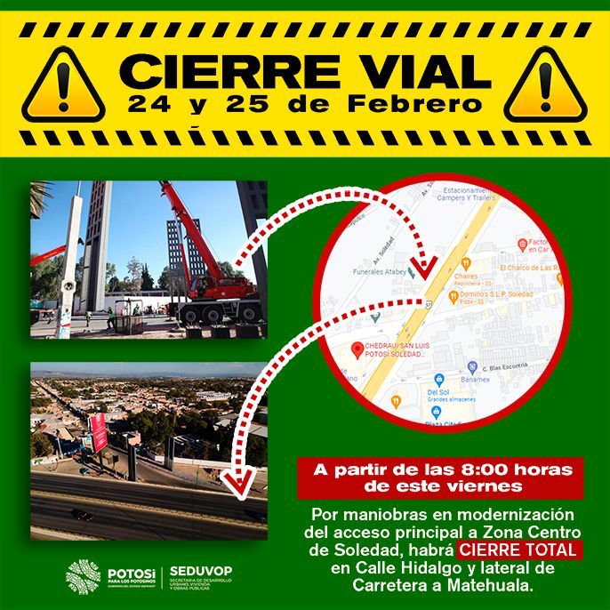 Dando continuidad al proceso de modernización del Estado que el Gobernador de San Luis Potosí, Ricardo Gallardo Cardona, ha emprendido en las cuatro zonas de la entidad, la Secretaría de Desarrollo Urbano, Vivienda y Obras Públicas (Seduvop) dio a conocer que los días 24 y 25 de febrero a partir de las 8:00 horas, se llevará a cabo el cierre vehicular del acceso a la zona centro de Soledad de Graciano Sánchez, para concluir el montaje para la estructura del acceso monumental.