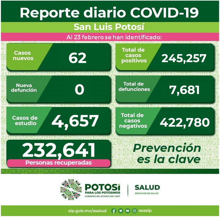 En la Jurisdicción Sanitaria I se detectaron 47 de los nuevos casos; tres, en la Jurisdicción Sanitaria II de Matehuala; uno, en la Jurisdicción Sanitaria III de Villa de Pozos; 11, en la Jurisdicción Sanitaria V de Ciudad Valles y ningún caso nuevo registrado en personas residentes de otra Entidad ni en las jurisdicciones sanitarias IV de Rioverde, VI de Tamazunchale y VII de Tancanhuitz.