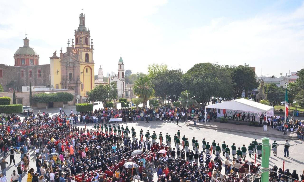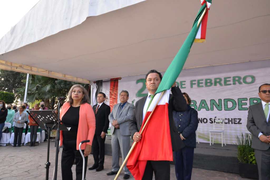 La alcaldesa, Leonor Noyola Cervantes, acompañada de autoridades educativas, militares e integrantes del gabinete municipal, conmemoraron el Día de la Bandera con un evento cívico realizado en el jardín principal del municipio.