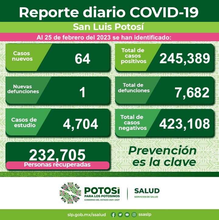 Sobre el Informe Diario de casos Covid-19, se reportan 64 nuevos contagios confirmados en la Entidad; registrándose hasta este 25 de febrero 245 mil 389 casos totales de este padecimiento y 232 mil 705 personas han recibido el alta sanitaria.
