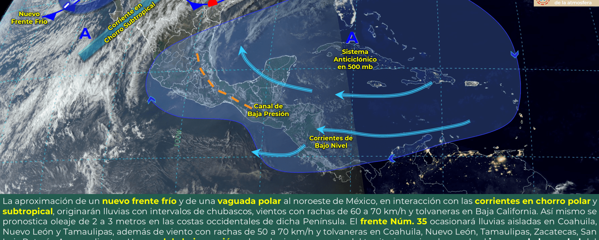 Viento con rachas de 40 a 60 km/h y tolvaneras: Baja California Sur, Sinaloa, Durango, Coahuila, Nuevo León, Zacatecas, San Luis Potosí, Aguascalientes, Jalisco, Guanajuato, Querétaro, Hidalgo, Estado de México, Ciudad de México, Tlaxcala, Puebla, Oaxaca y Chiapas.