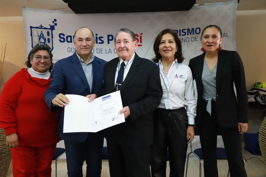 El Alcalde Enrique Galindo instó a la Directora de Turismo, Claudia Peralta Antiga, a que haga una alianza estratégica con las y los guías turísticos para compartir conocimientos a funcionarios y servidores públicos, así como a los grupos de adultos mayores y personas con discapacidad, “para que conozcan la ciudad a través de la voz y la experiencia, el conocimiento y la información de los guías de San Luis Potosí”.