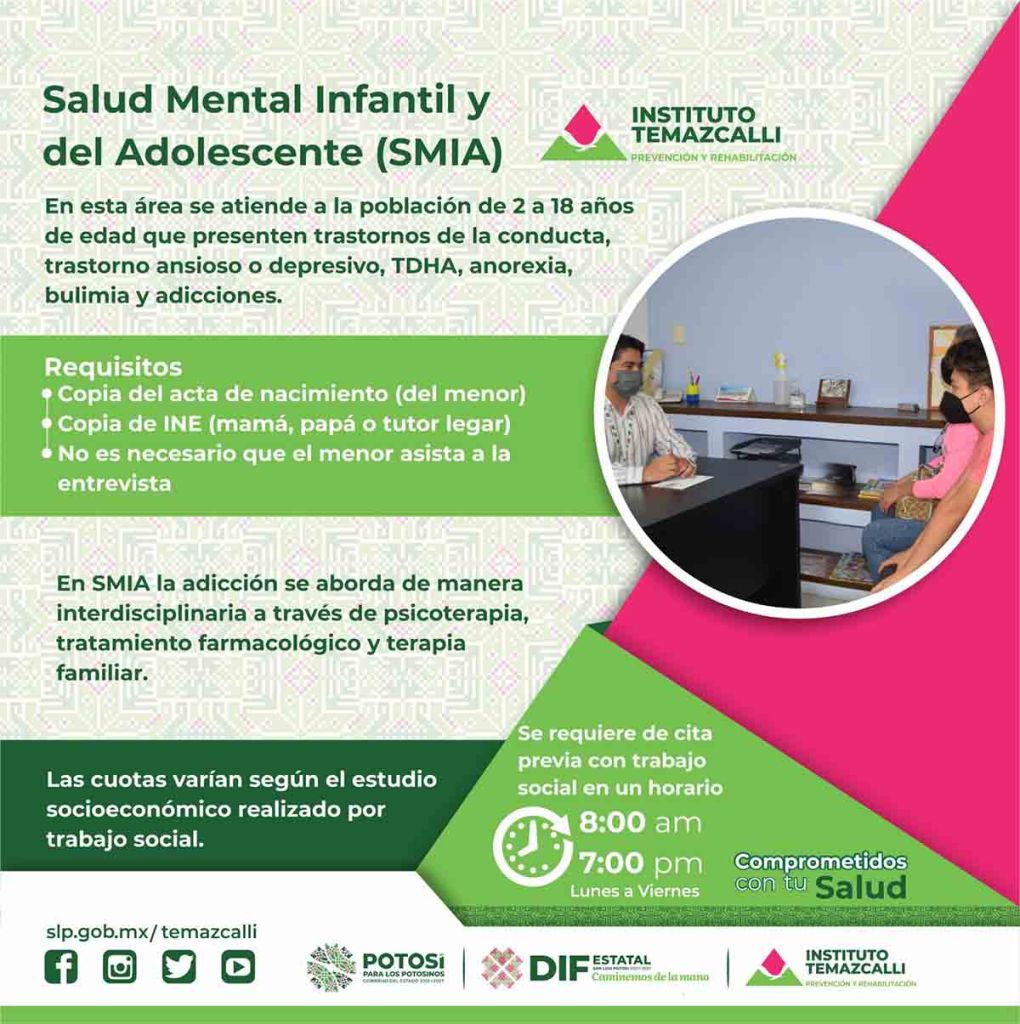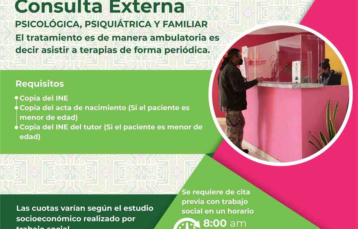 El titular de la dependencia, René Contreras Flores, reveló que se ofrecen terapias por medio del área de rehabilitación de consulta externa, para mayores de 15 años que presenten consumo de sustancias y trastornos de la conducta alimentaria, además del área de Salud Mental Infantil y del Adolescente, en atención a niñas, niños y adolescentes de dos a 18 años, con trastornos del neurodesarrollo, ansiosos, depresivos y déficit de atención con o sin hiperactividad (TDAH).
