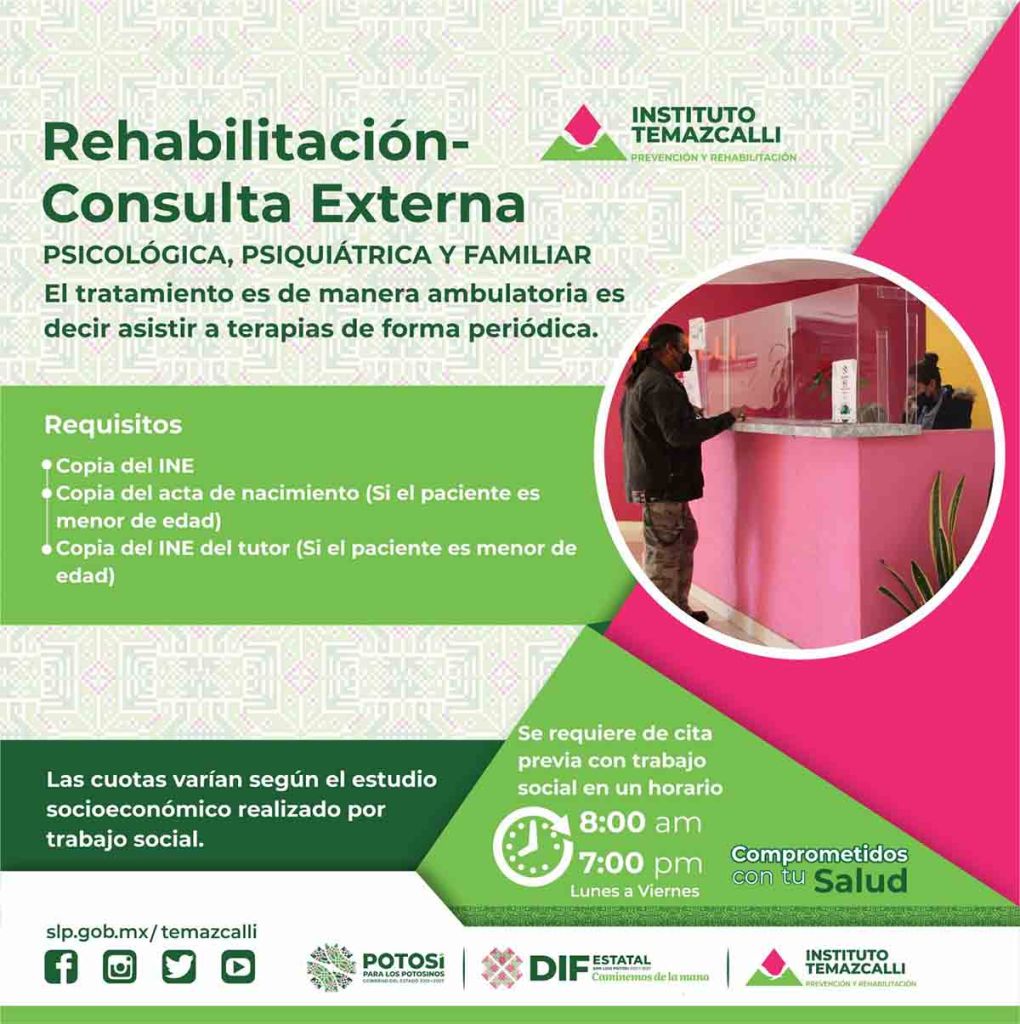 Destacó que para iniciar tratamiento, es necesario acudir directamente al departamento de trabajo social con copia del INE. En caso de ser menor de edad, traer copia de acta de nacimiento del menor y copia de identificación del familiar o responsable legal. “Es importante que se acerquen para recibir ayuda, estamos en un horario de 8:00 a 20:00 horas de lunes a viernes, y nuestros teléfonos son el 4448126196 y 4448147680, o bien acudan a nuestras instalaciones en Calzada Fray Diego de la Magdalena 106 Col. Industrial Aviación, a un costado de la Estación de Bomberos junto al Parque Tangamanga 2”, finalizó.