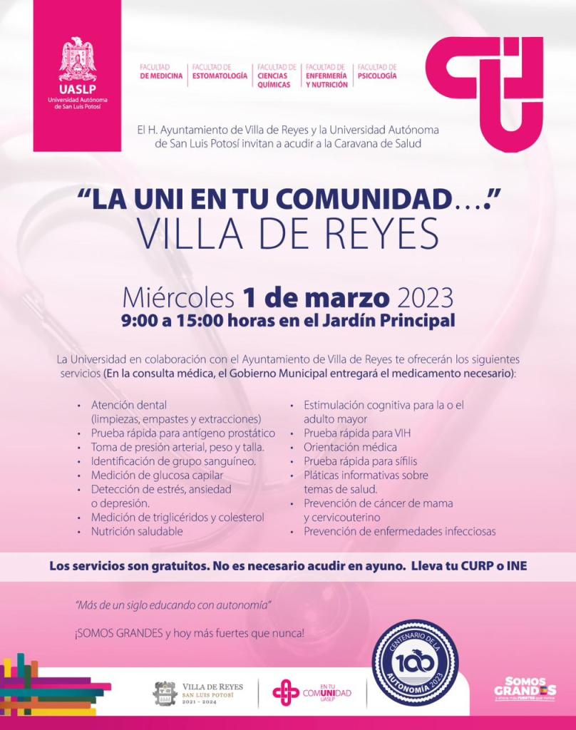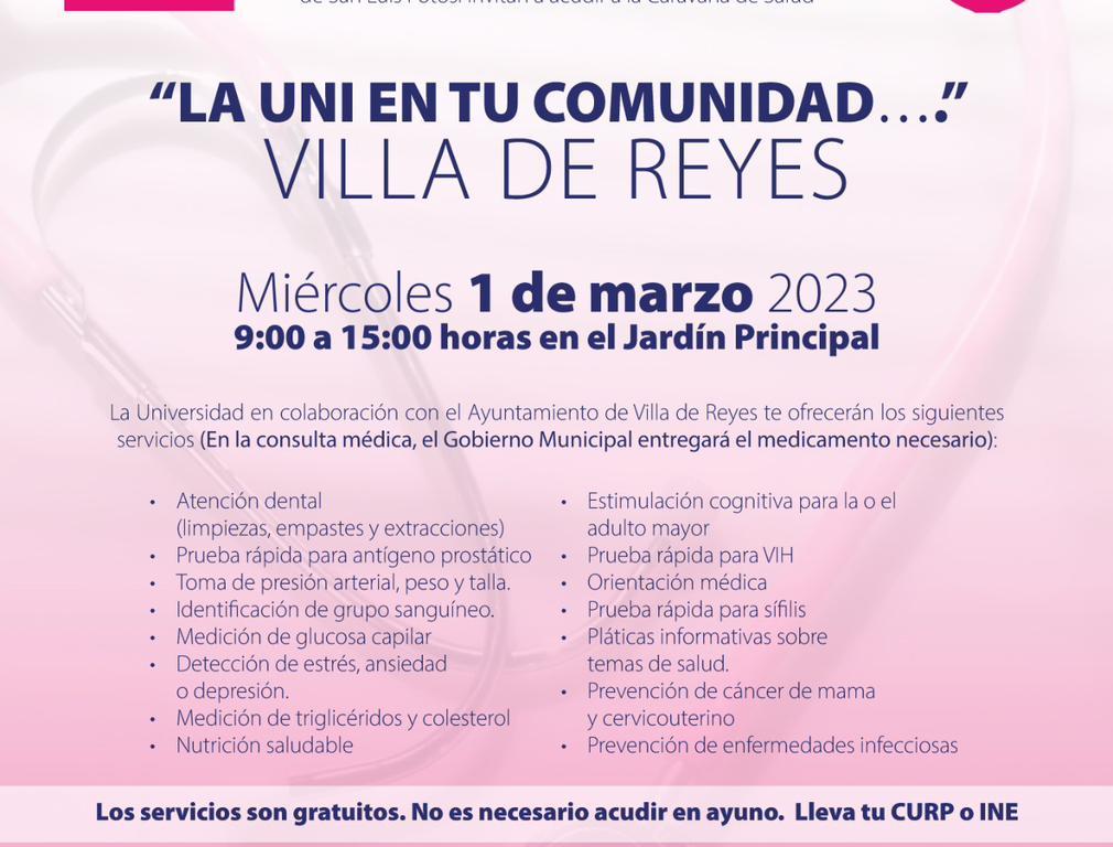El H. Ayuntamiento de Villa de Reyes y la Universidad Autónoma de San Luis Potosí (UASLP) llevarán a cabo el programa “Caravana de la Salud”, en el que ofrecerán diversos servicios totalmente gratuitos a la población del municipio, con el que se busca fortalecer la vinculación con la sociedad.